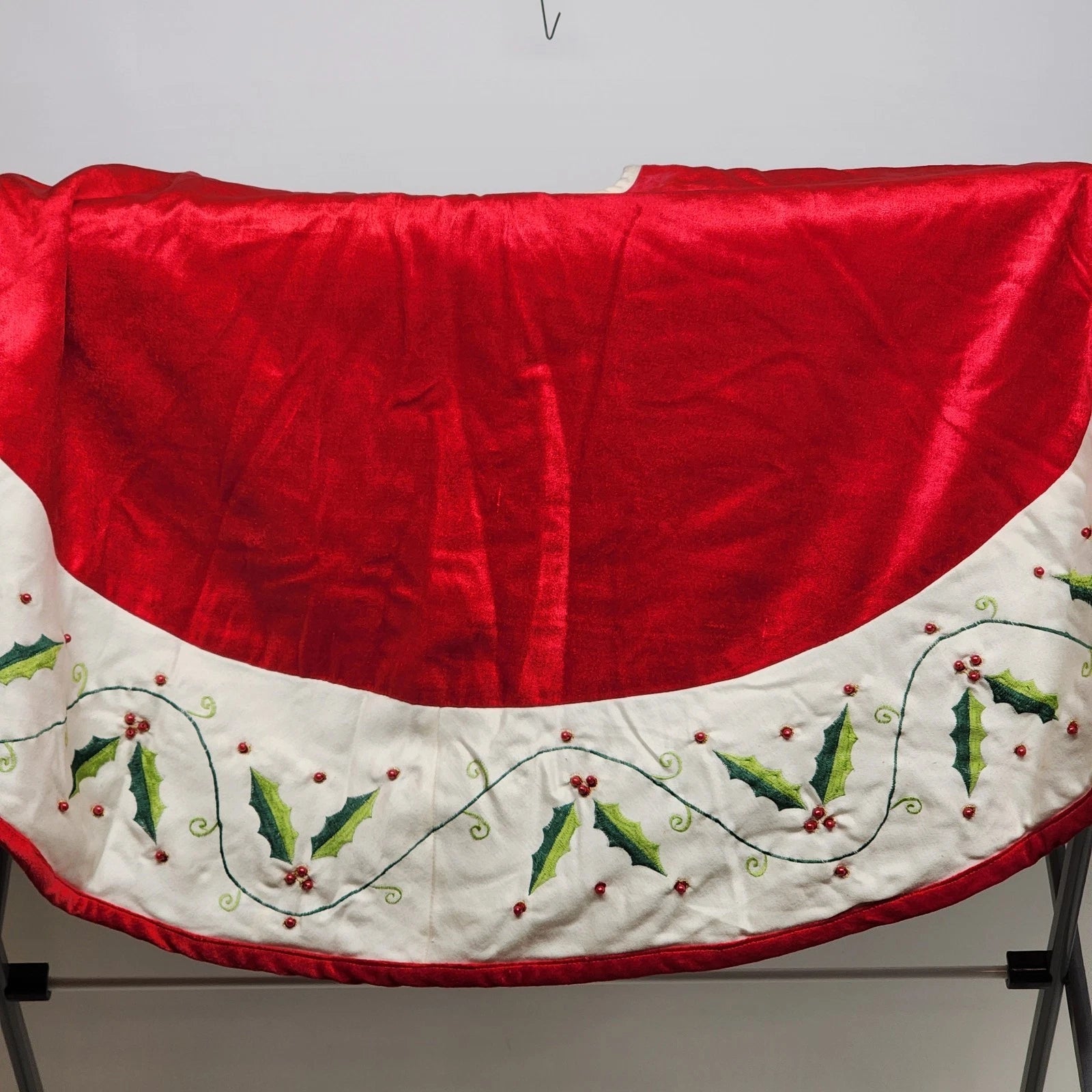 Red Christmas Tree Skirt 48" with Round White Holly Berries Trim Buttons Holiday
