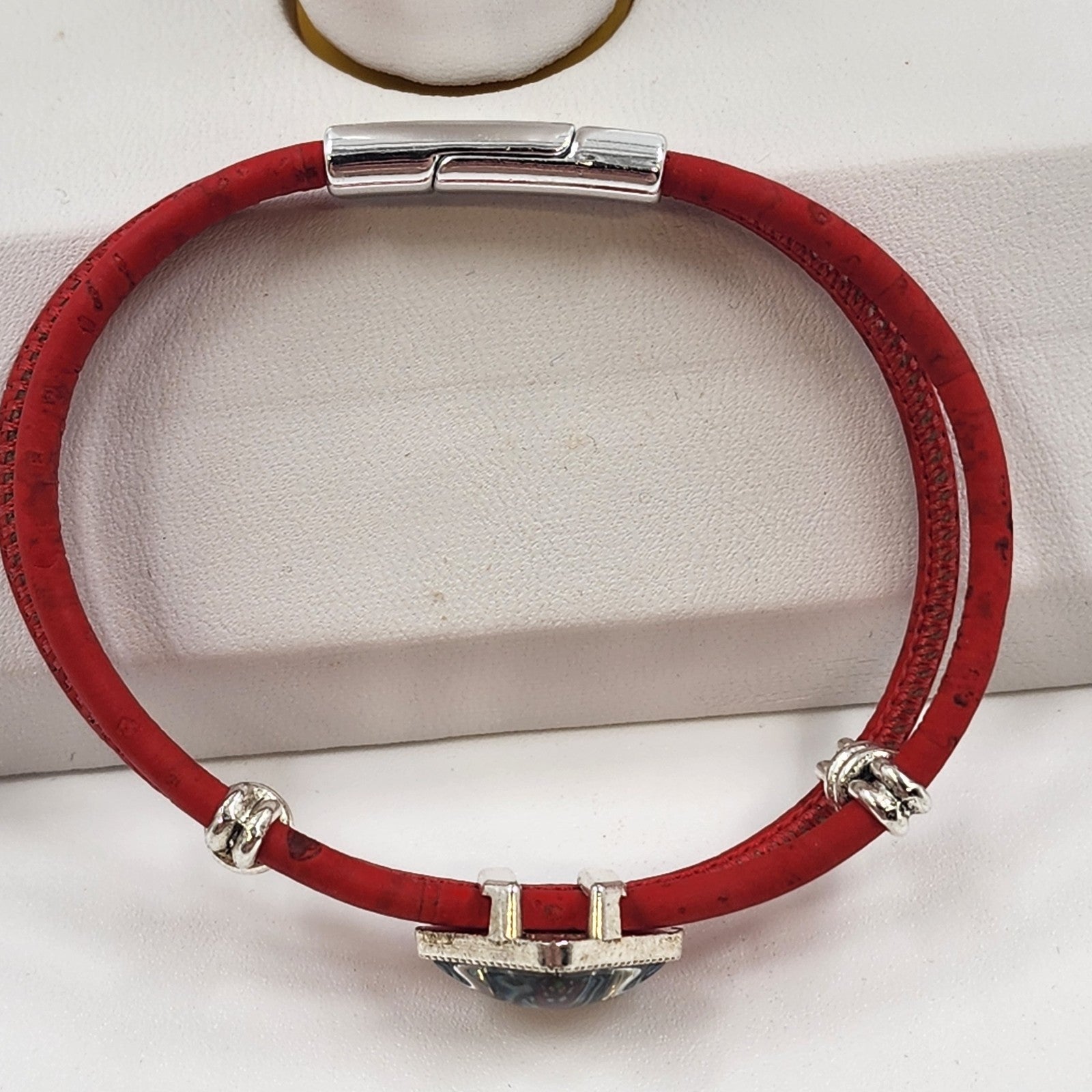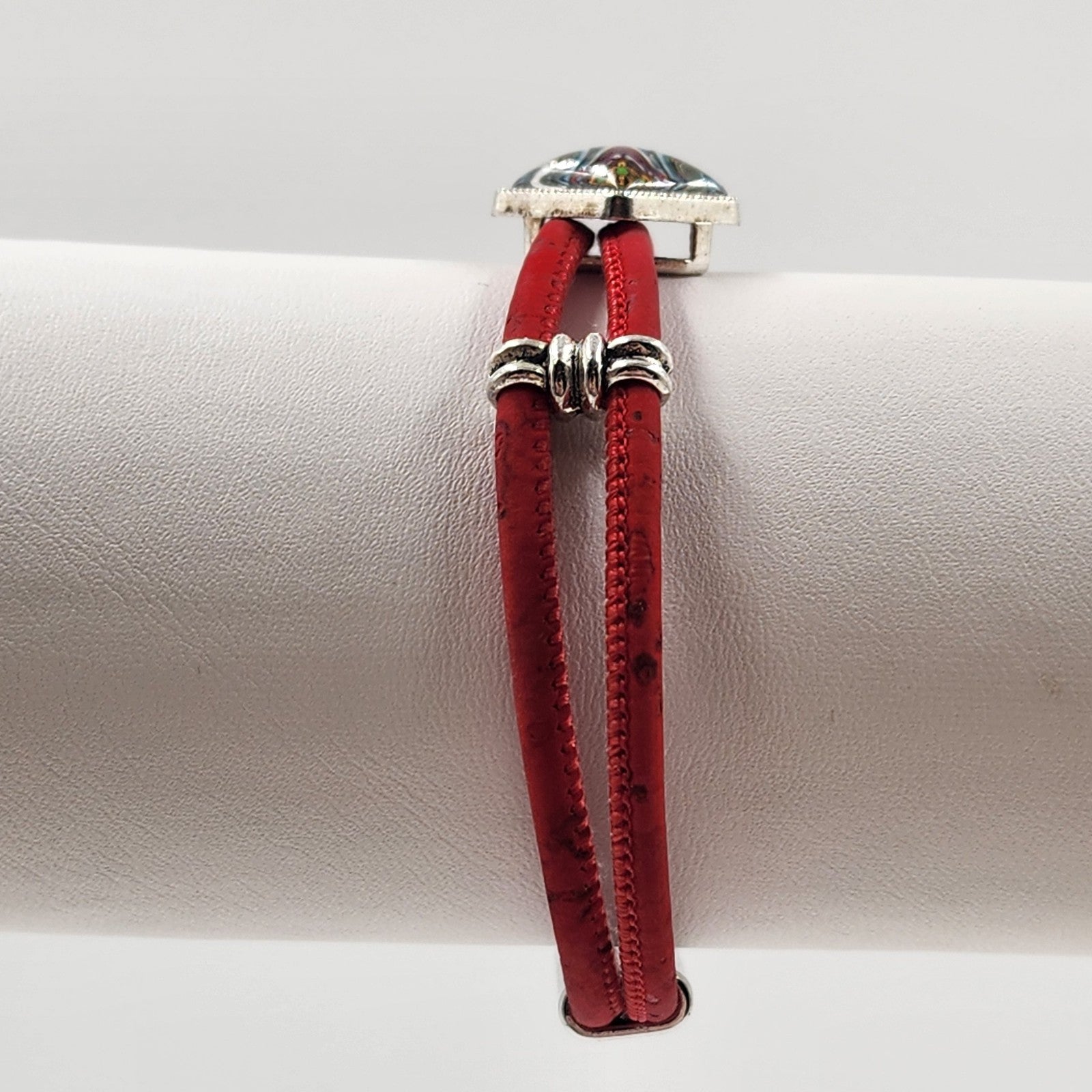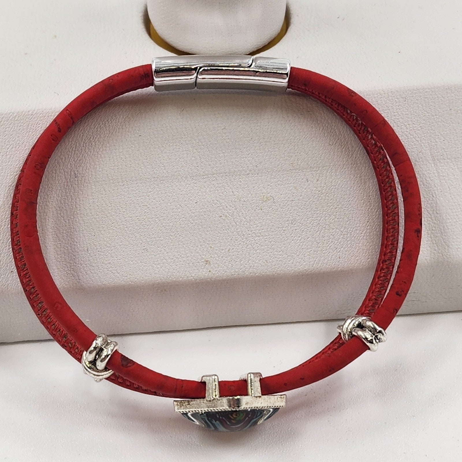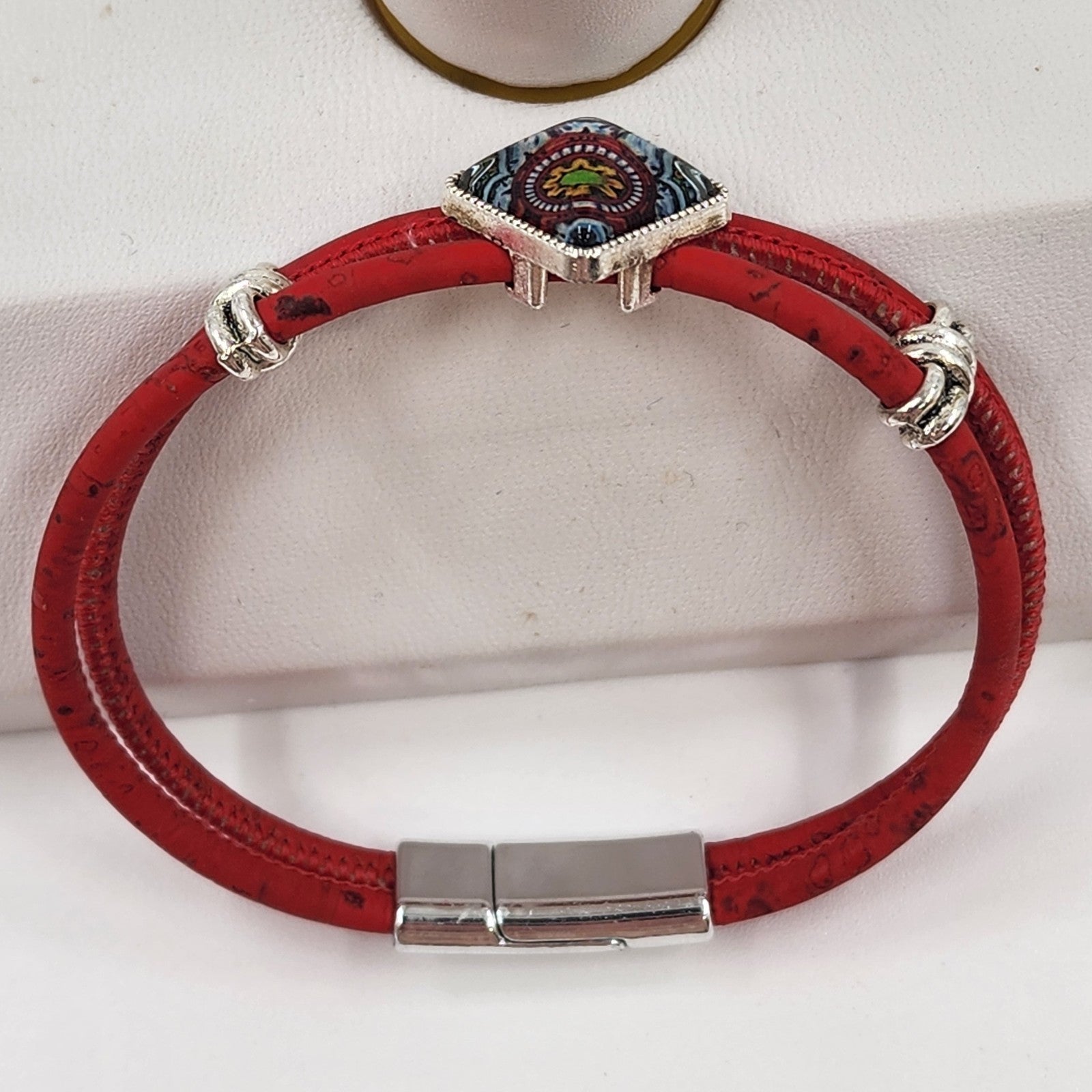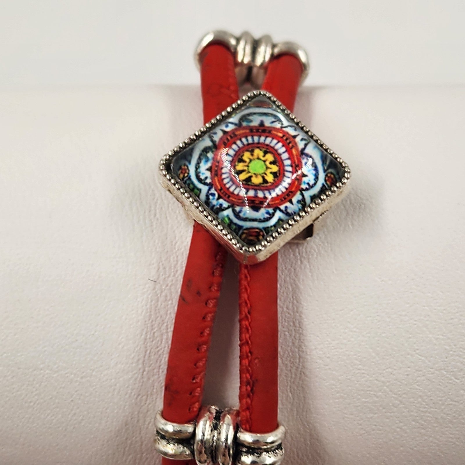 Add a touch of artistic charm to your accessory collection with this red cord bracelet, featuring a silver-tone mosaic slide charm with an intricate, colorful design. The bold red cord, paired with elegant silver-tone accents, creates a unique and stylish piece perfect for any occasion.