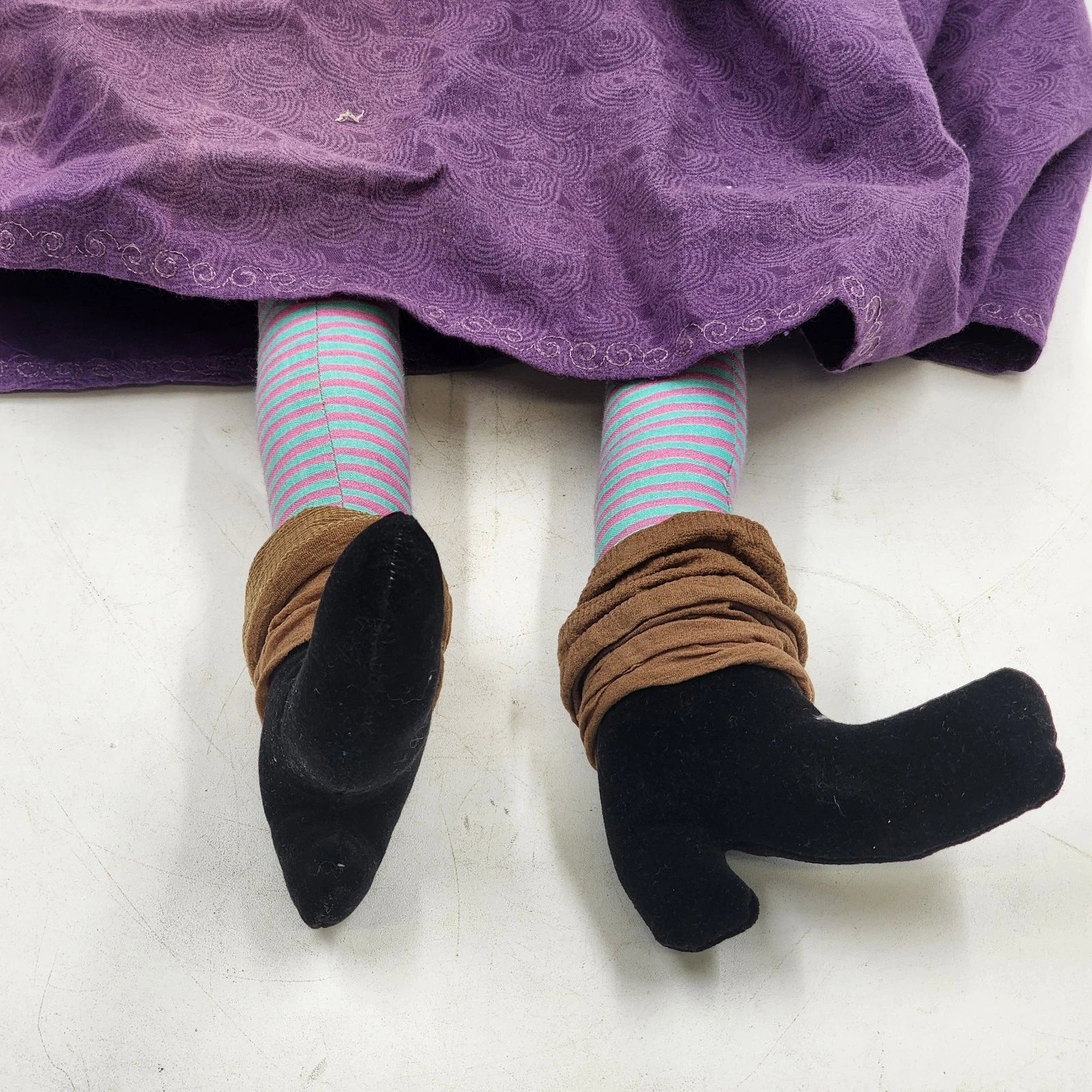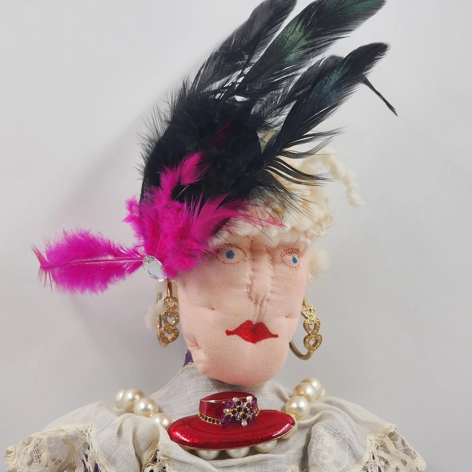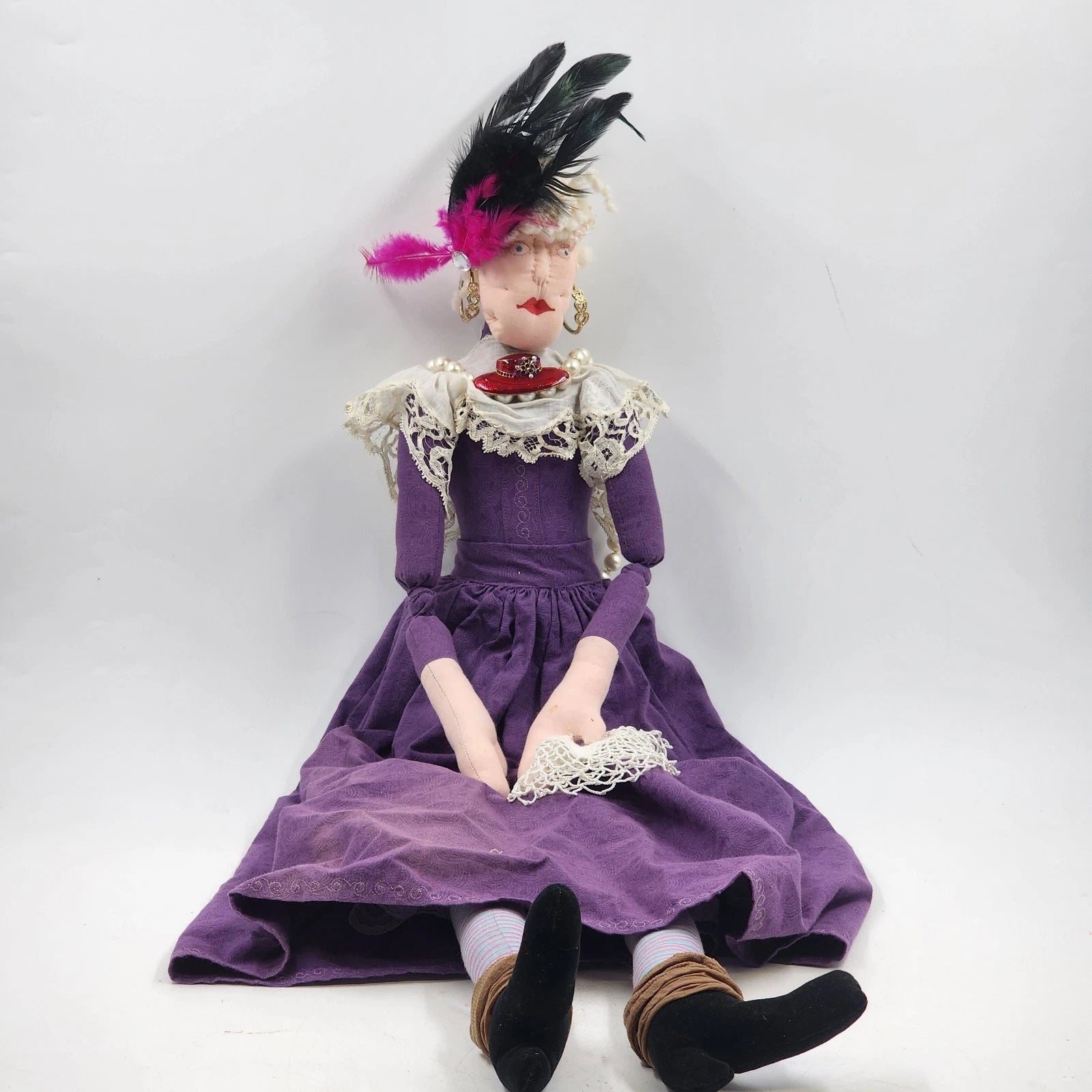 Celebrate the "Red Hat" spirit with this magnificent Handmade 37" Red Hat Society Lady. This is a one-of-a-kind (OOAK) cloth art doll, meticulously crafted to represent the elegance and whimsy of the society. Dressed in a rich purple gown and a dramatic wide-brimmed red hat adorned with feathers, she is ready for a luncheon or a place of honor in your home.