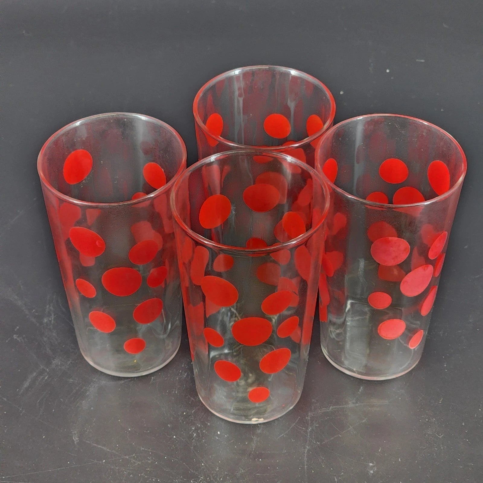 Red Polka Dot Glass Tumblers Set of 4 Clear Drinking Glasses 5" Tall 1960's Vtg