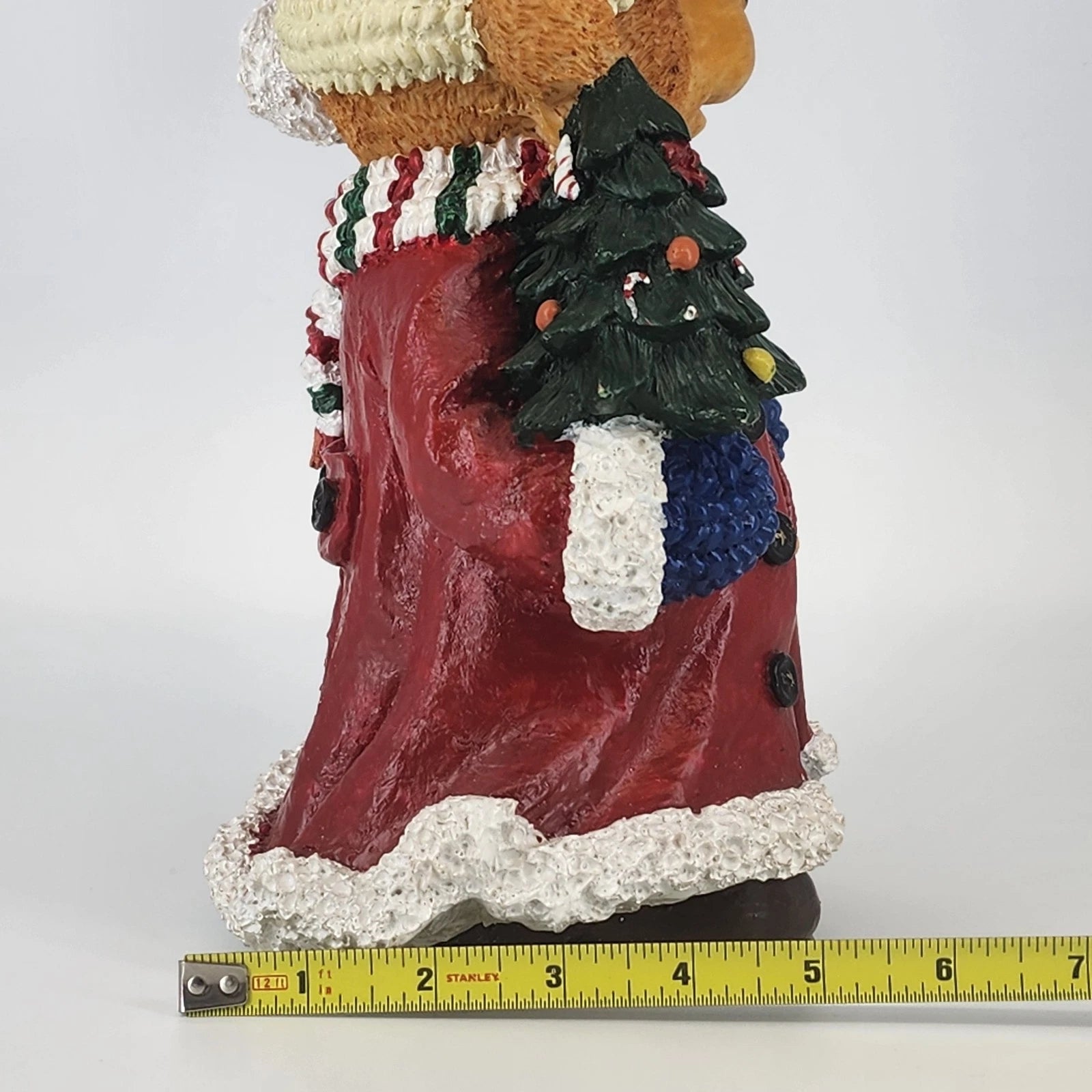 Add a touch of vintage charm to your holiday decor with this beautifully detailed resin teddy bear figurine. Dressed in a cozy red winter coat with white trim, a festive hat, and a striped scarf, this hand-painted bear captures the heart of the Christmas season. In one arm, the bear cradles a miniature decorated Christmas tree, while the other holds a sweet golden puppy, making it a heartwarming addition to any mantle or holiday display. With its substantial size and classic "Bearstone" style, this collectible piece is perfect for teddy bear enthusiasts and vintage holiday lovers alike.