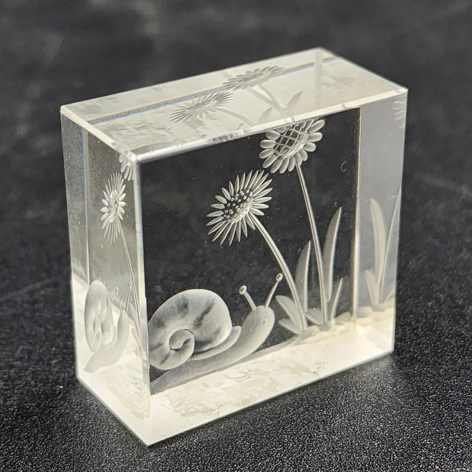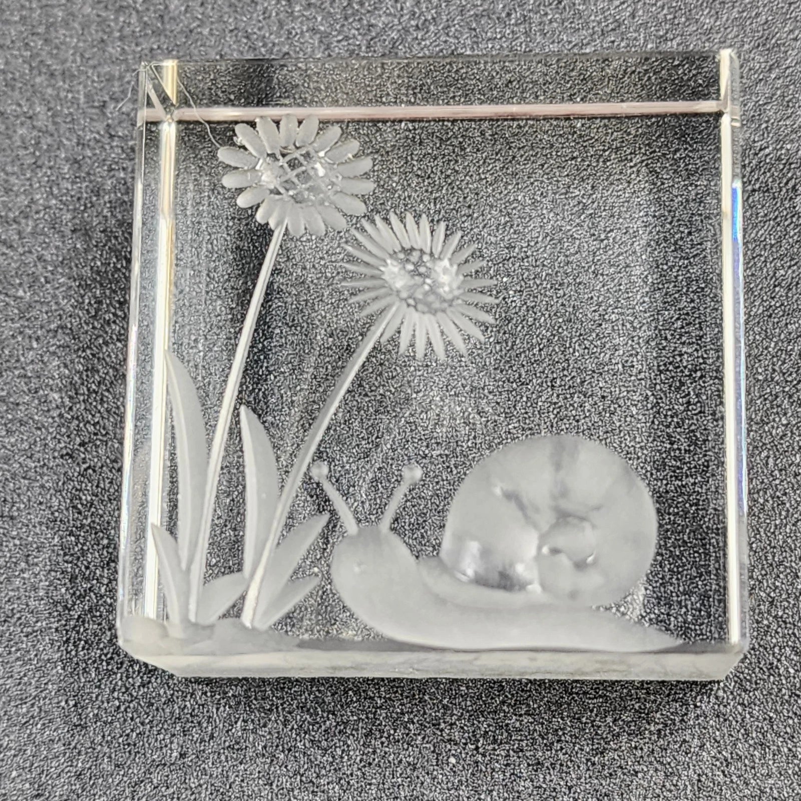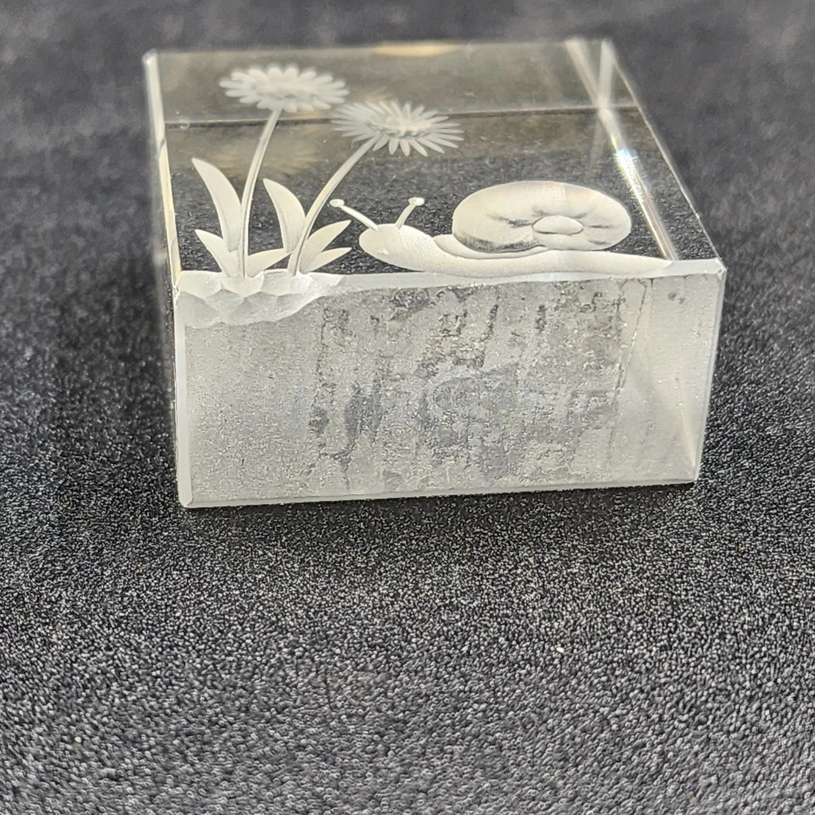 Reverse Etched Glass Paperweight Snail & Flower Design Clear Cube Collectible