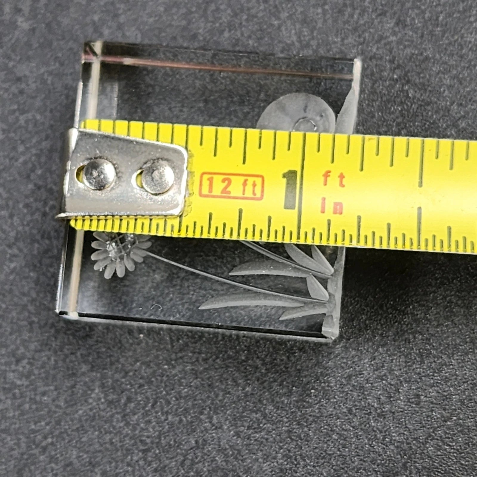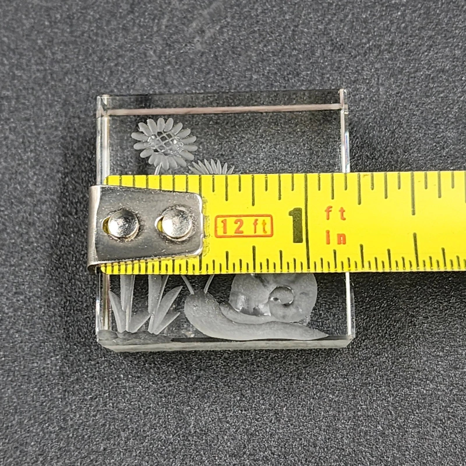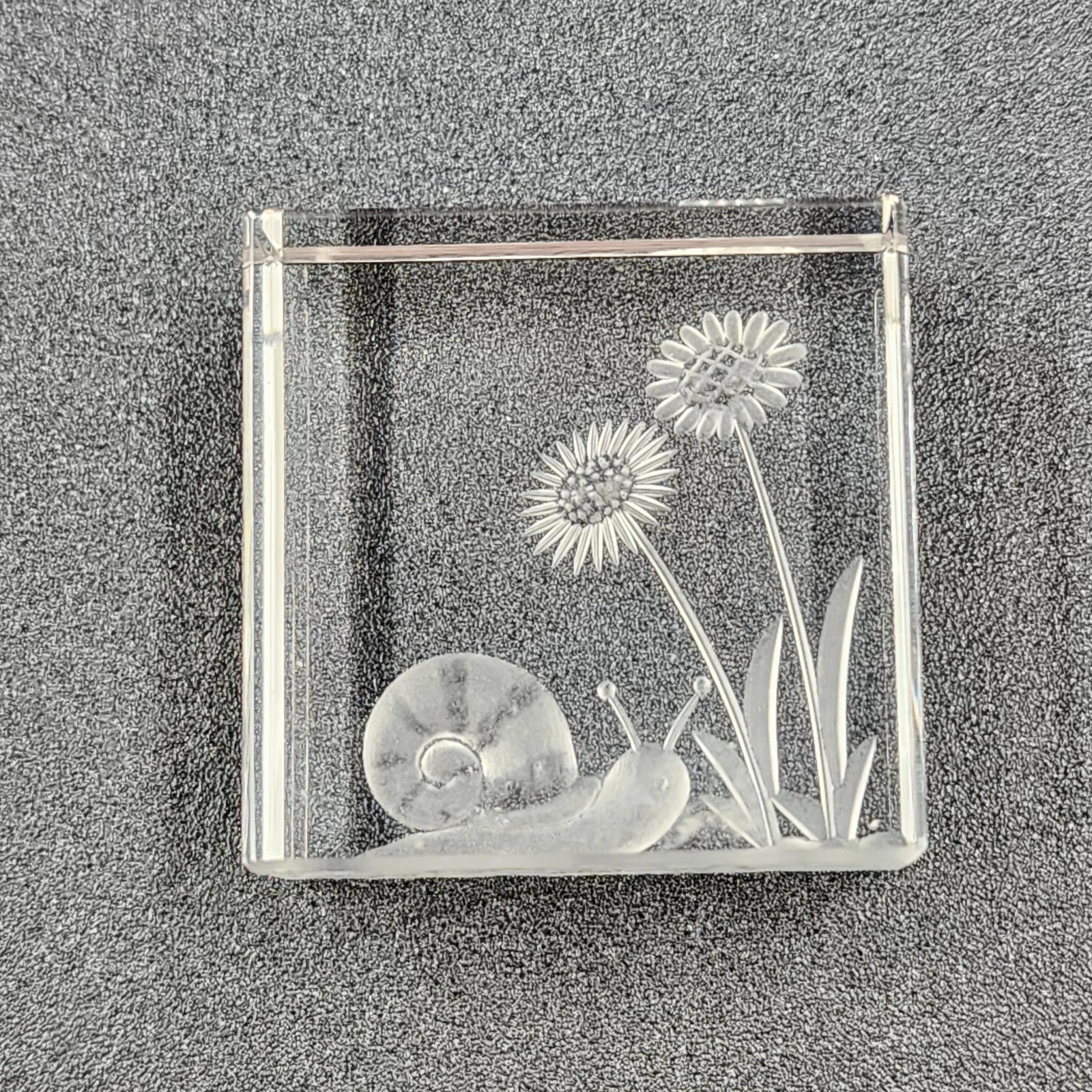 Reverse Etched Glass Paperweight Snail & Flower Design Clear Cube Collectible