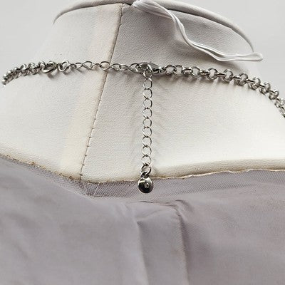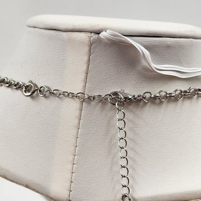 Delicate and charming, this RMN silver tone necklace features a rolo chain adorned with green and yellow flower accents and a sparkling rhinestone center. A whimsical, garden-inspired piece perfect for spring or summer outfits.