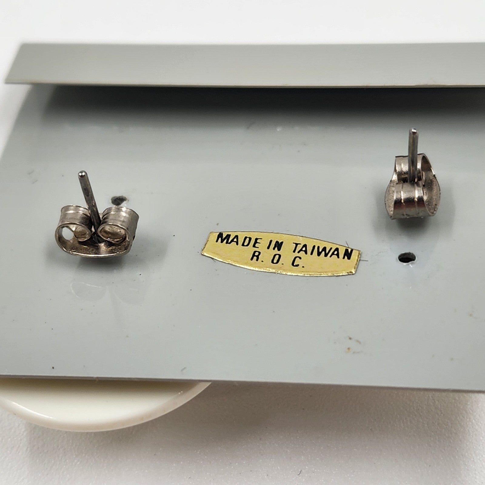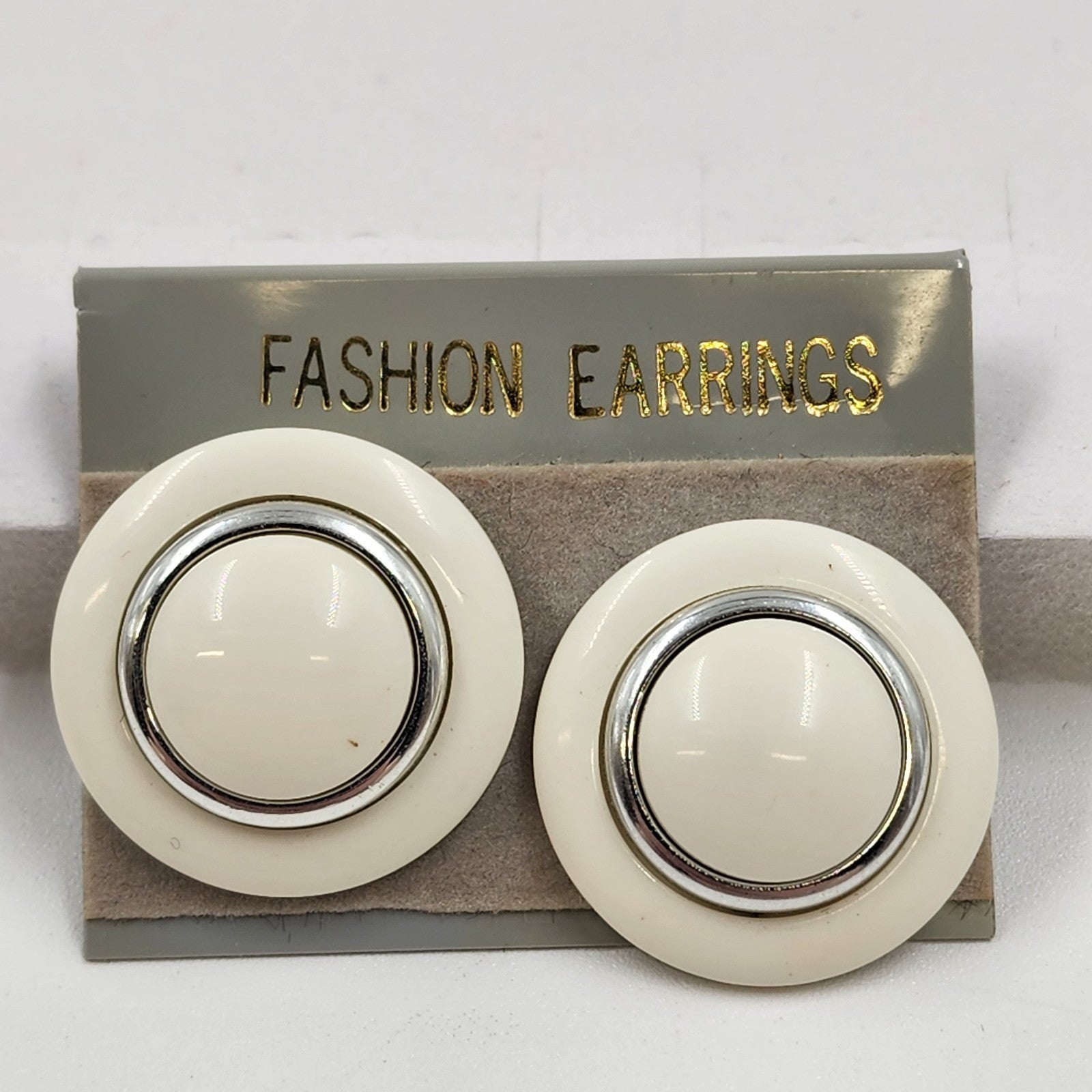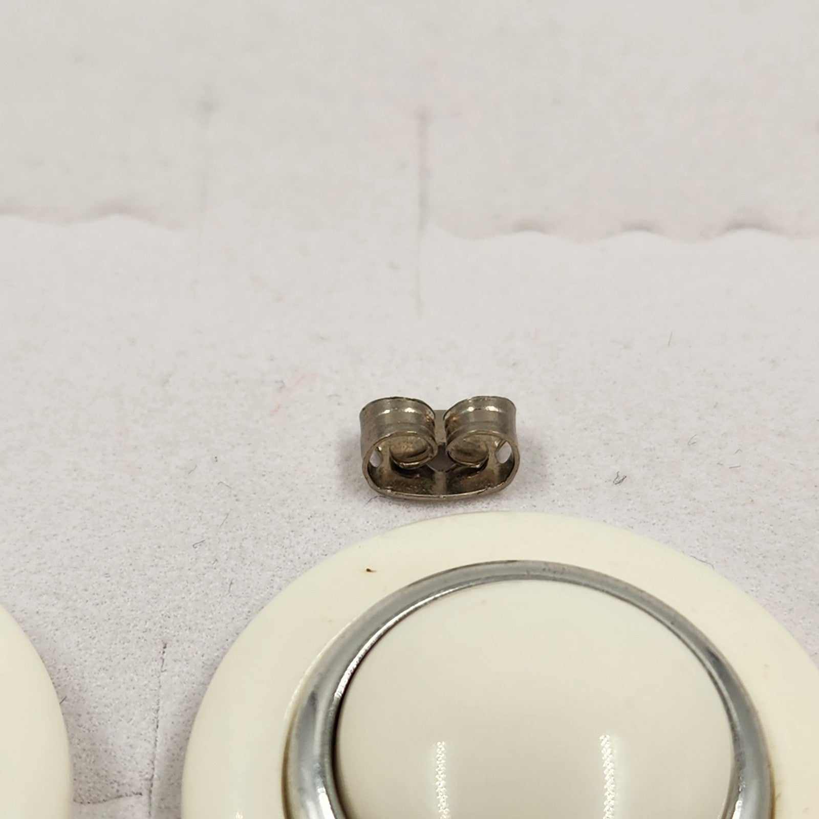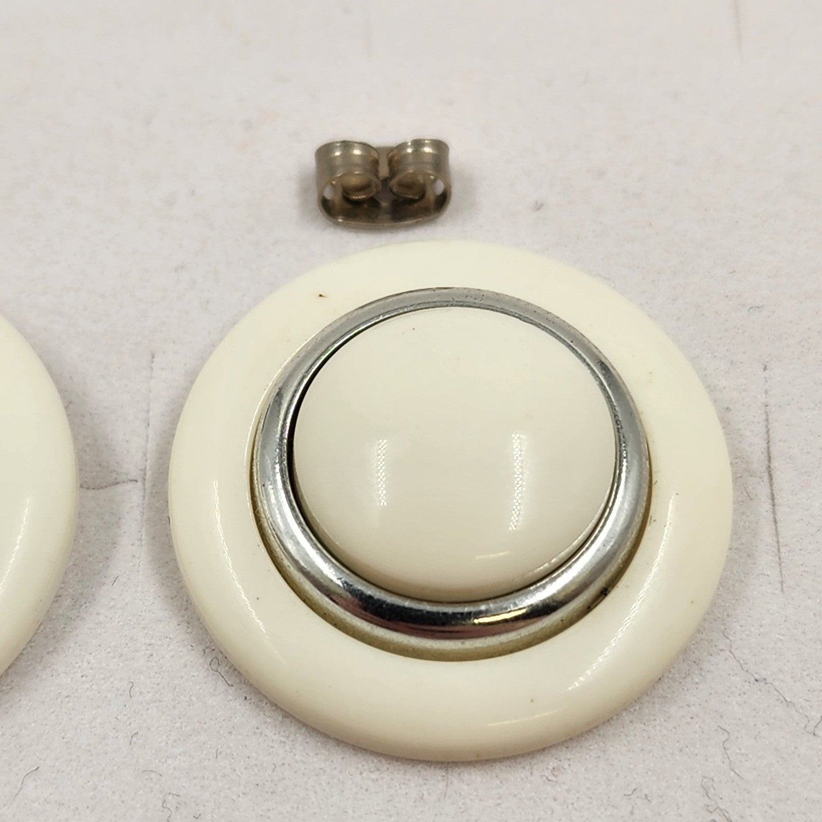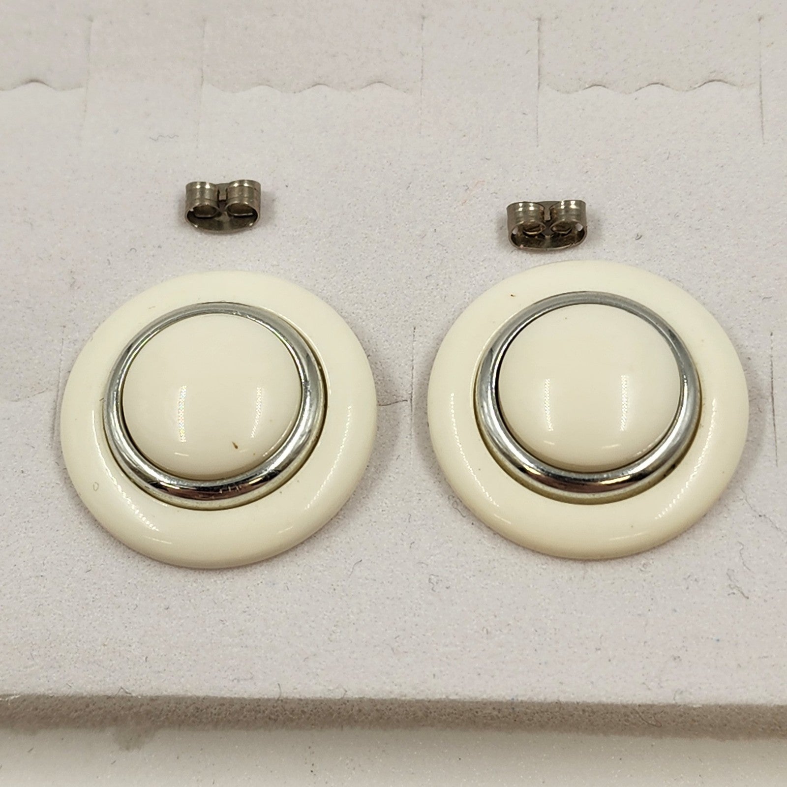 Round White & Silver Tone Pierced Earrings 1” Button Studs Butterfly Closure