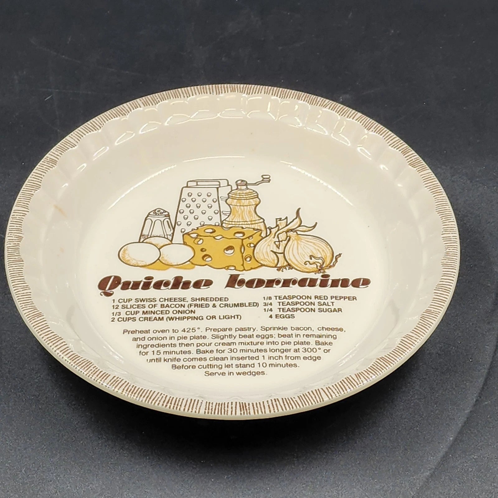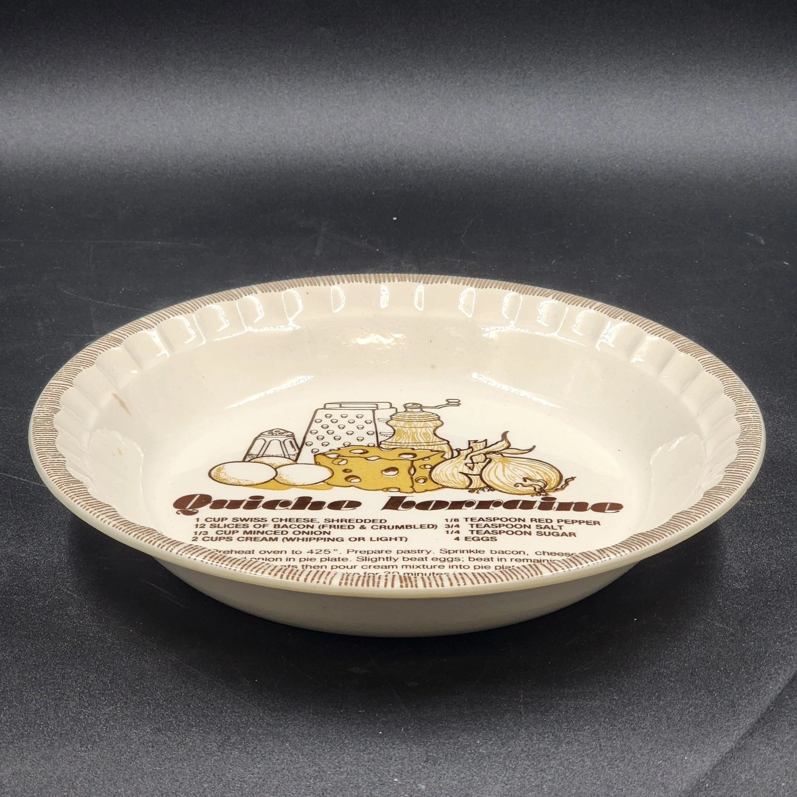 Charming vintage Royal China by Jeannette Quiche Lorraine pie plate, featuring the recipe printed directly on the interior. This collectible 11-inch round ceramic dish combines utility with vintage kitchen charm - perfect for baking or display.
