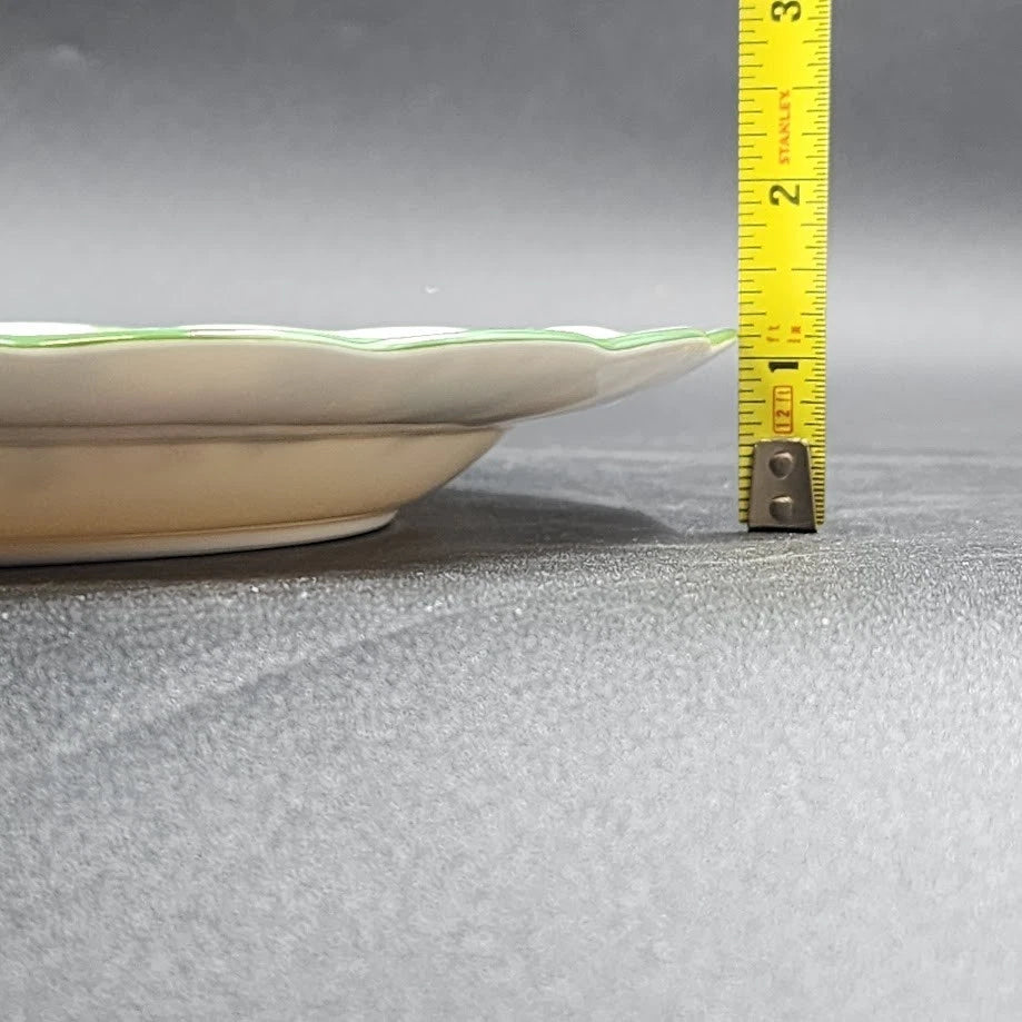 Design: Scalloped edge, multicolor floral design, and green trim.