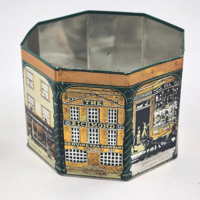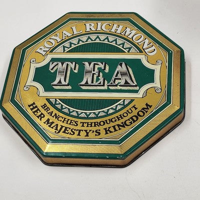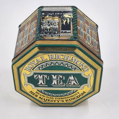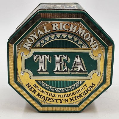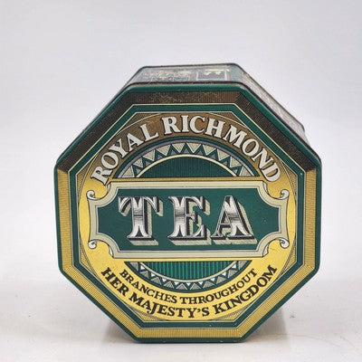 This vintage Royal Richmond Tea metal tin canister from the 1980s is a charming collectible or practical storage solution. Featuring classic English design and branding, it was manufactured in England and originally used to store Royal Richmond Tea. Ideal for vintage decor, display, or repurposing as a stylish container.