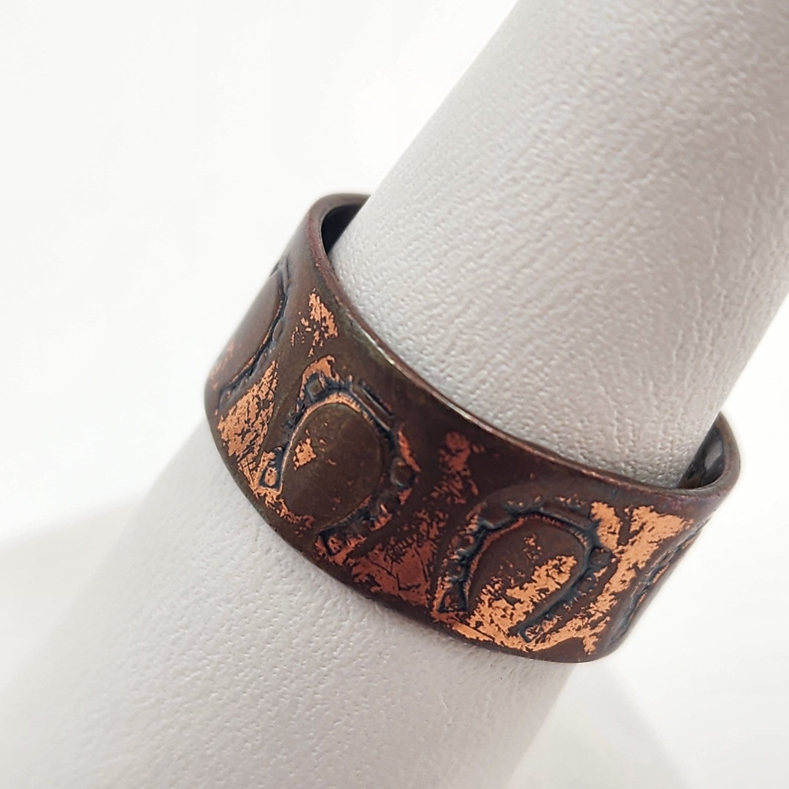 Copper band open shank ring with 5 horseshoes etched on the band.