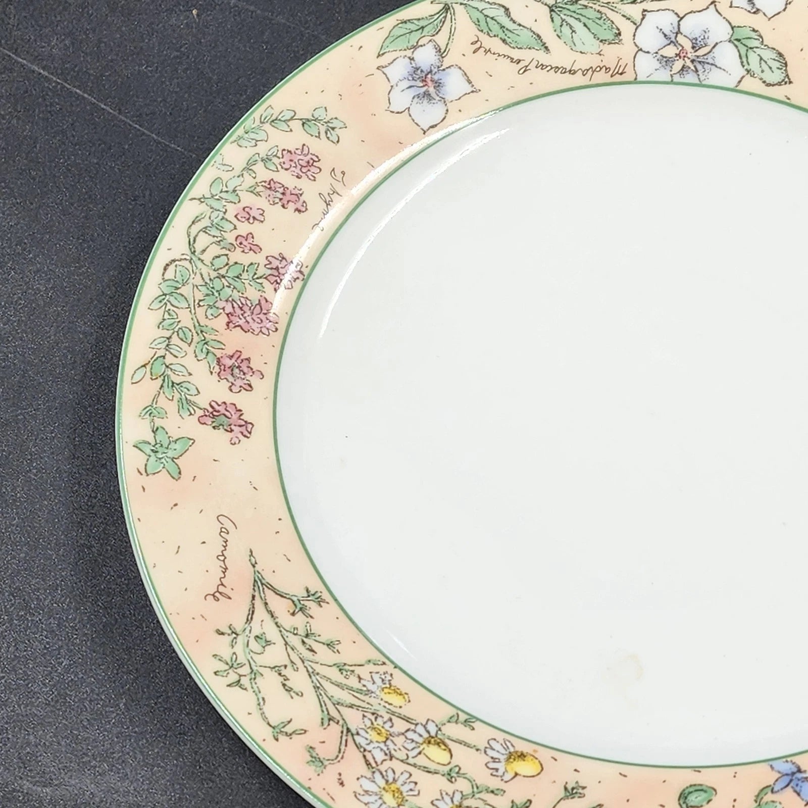 Add a touch of secret-garden charm to your dining room with this Set of 2 Sakura "Sachet" Dinner Plates. Designed by renowned artist Sue Zipkin in 1996, these plates are a celebration of nature, featuring a beautiful arrangement of labeled herbs and wildflowers set against a warm tan/peach border with a classic green trim.
