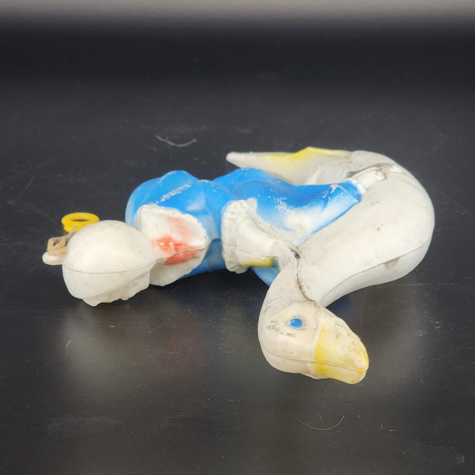 Take a trip down memory lane with this vintage 1970 SaniToy Mother Goose blow mold. Originally part of a musical nursery mobile, this charming piece features Mother Goose in her signature bonnet and spectacles, rendered in the classic mid-century primary color palette. Made of lightweight, durable blow-molded plastic, it is a perfect replacement piece for a vintage nursery set or a delightful standalone decor item for a retro-themed playroom. A true piece of 1970s Americana, this SaniToy collectible captures the whimsical spirit of classic nursery rhymes.