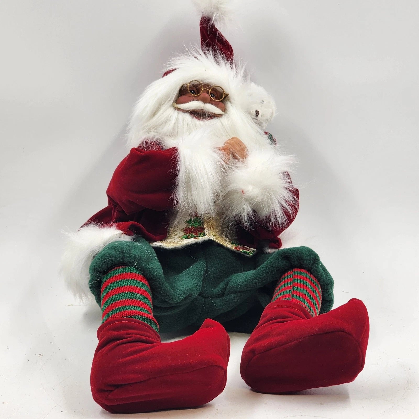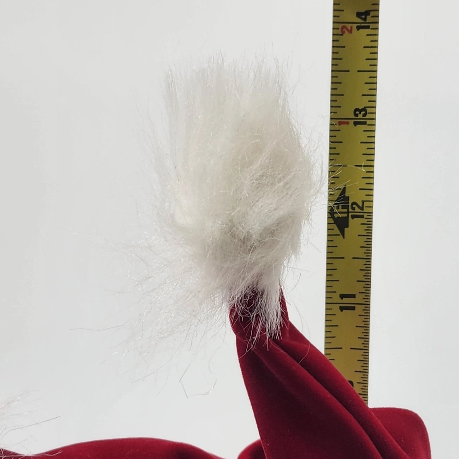 This whimsical Annalee Santa shelf sitter features a playful puppy on Santa's shoulder, dressed in a vest, coat, and sweatpants. A charming collectible perfect for holiday décor or adding character to your seasonal display.
