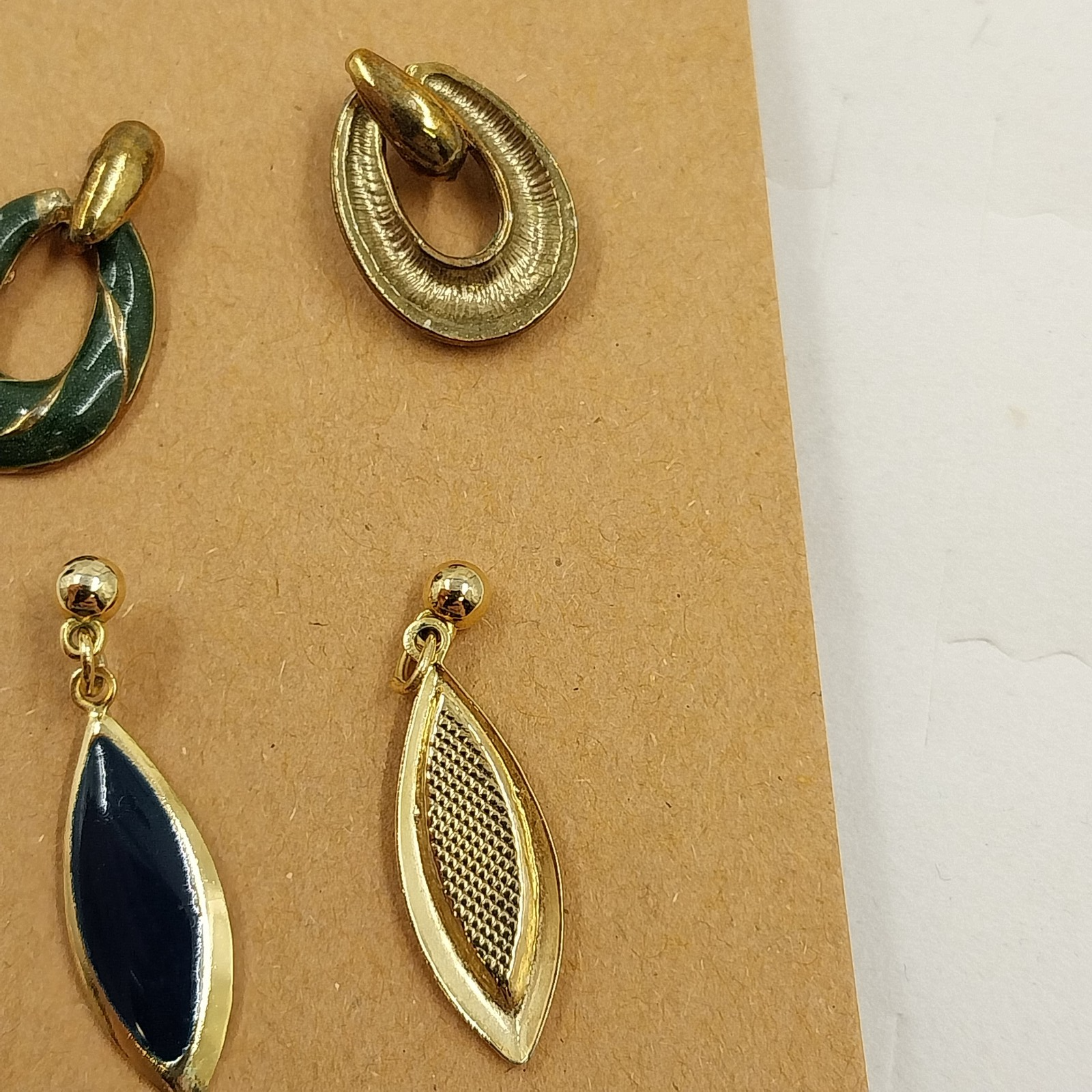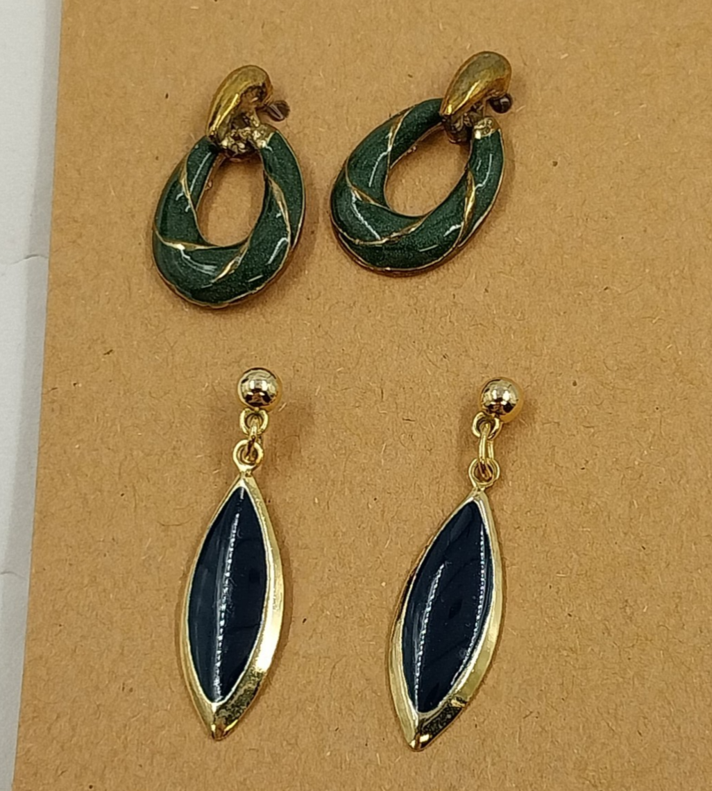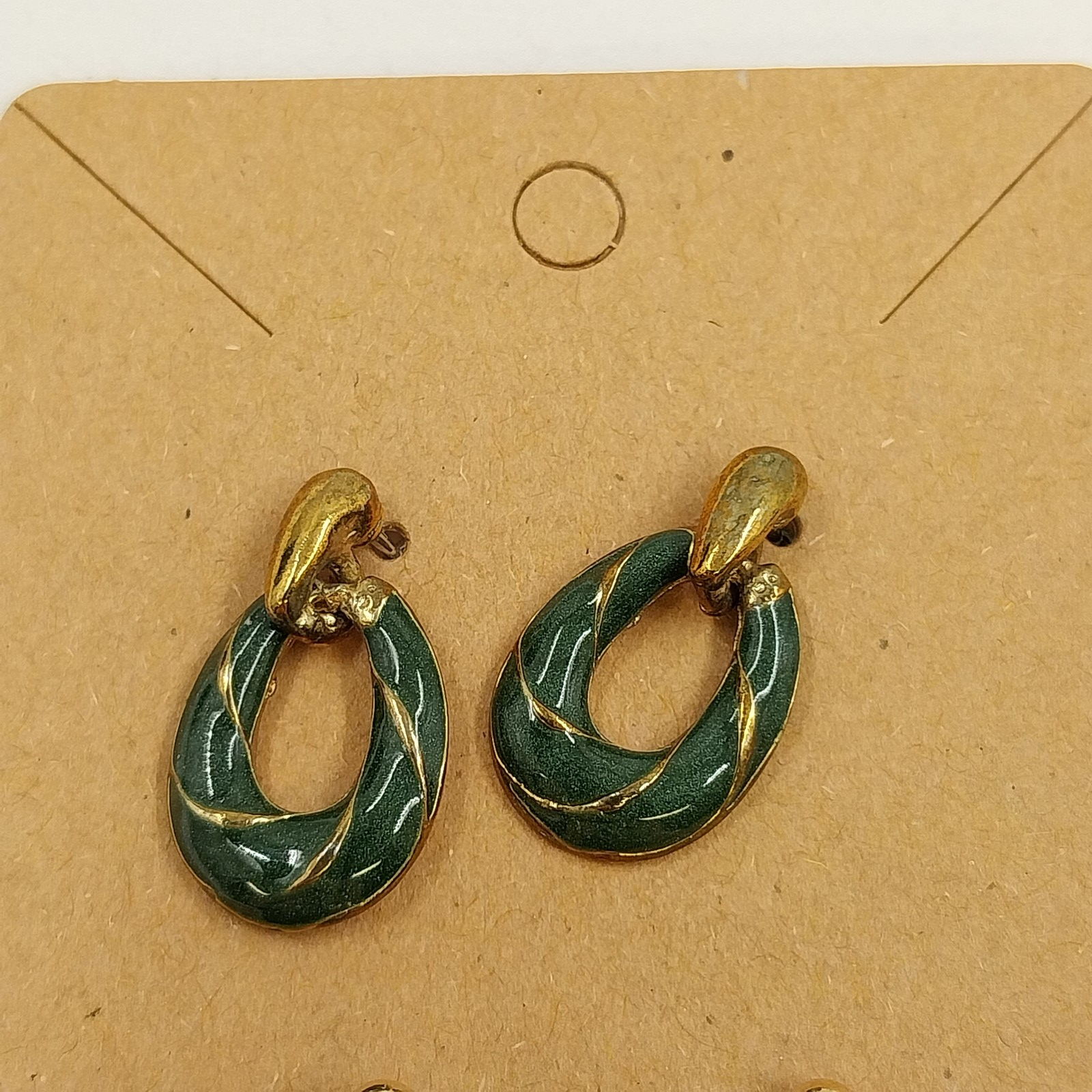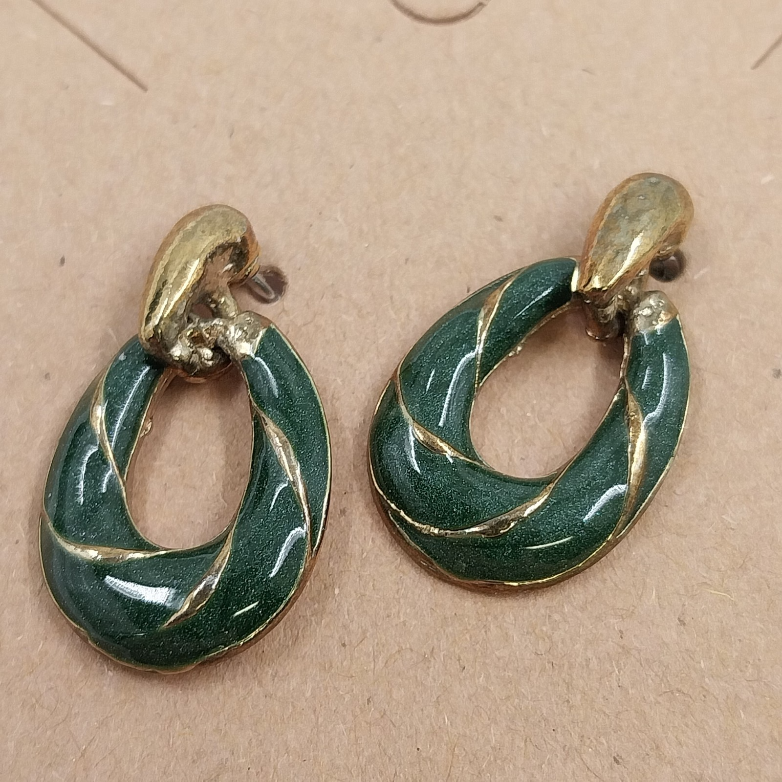 Green Oval Drop: Gold tone with green enamel, open hoop design, approximate drop: 0.75 inches