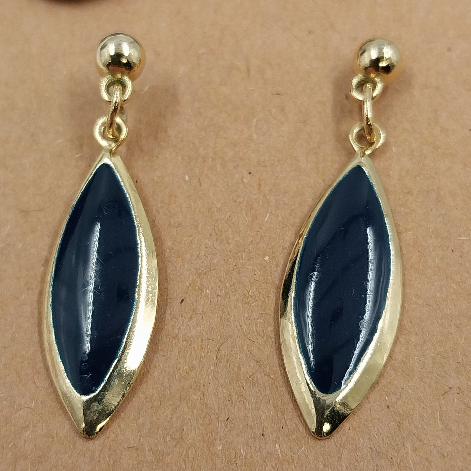 Black Teardrop: Gold tone with black enamel, approximate drop: 1.25 inches
