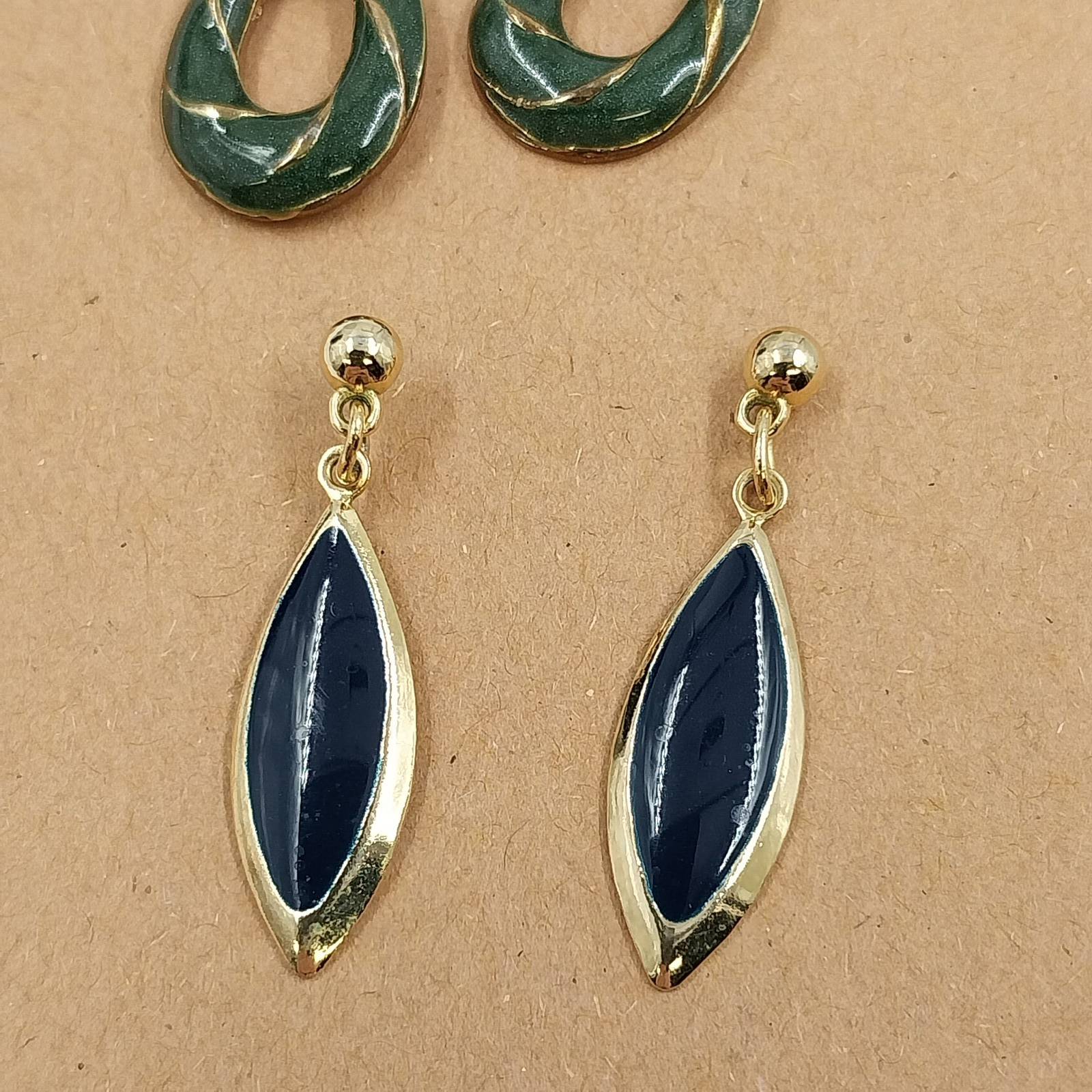 Set of 2 Drop Earrings Gold Tone Black Teardrop & Green Oval Dangle