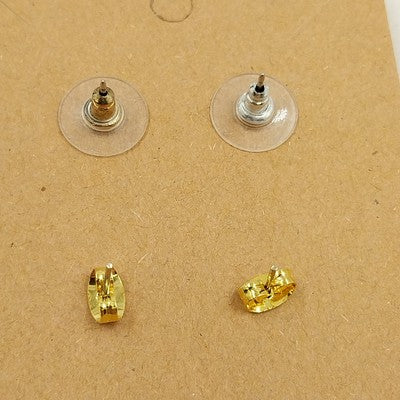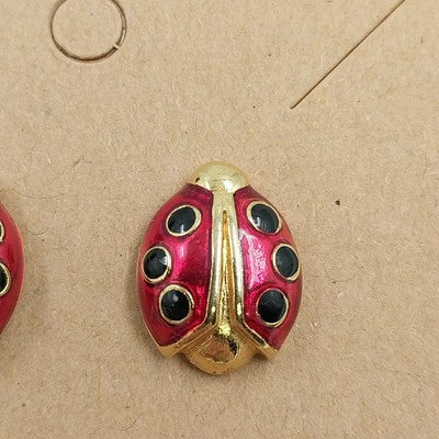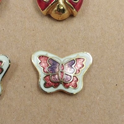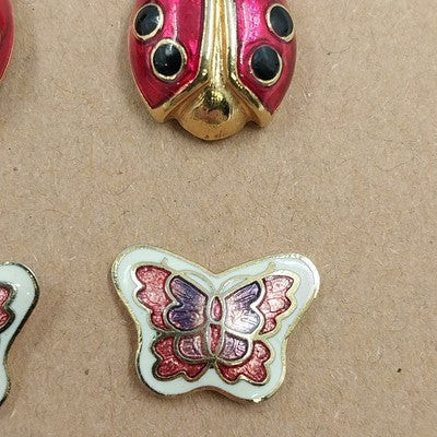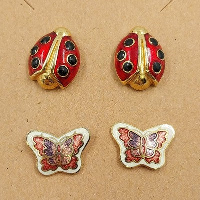 A charming set of stud earrings featuring delightful designs. One pair showcases gold-tone ladybugs with red and black enamel, while the other features multicolor cloisonne butterflies.