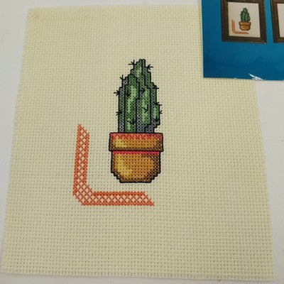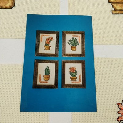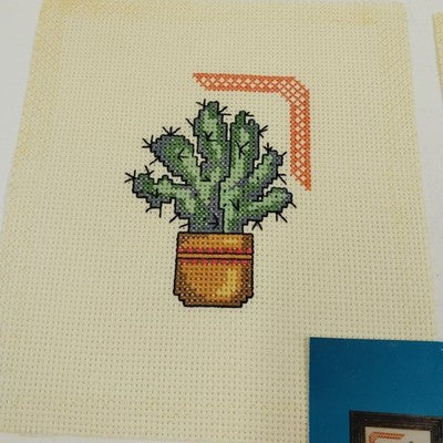Add handmade charm to your space or crafting collection with this set of 4 completed cross stitch pieces featuring mini desert plants in decorative vases. Each piece is carefully stitched on white Aida cloth, showcasing colorful cactus and succulent designs with lovely detail.