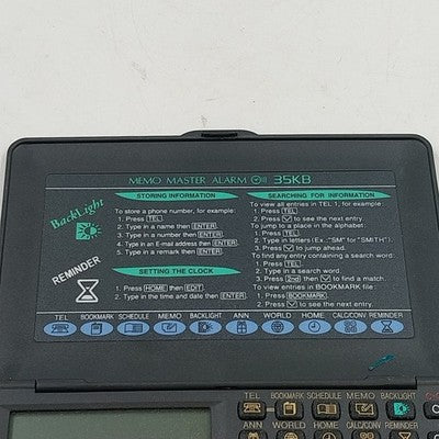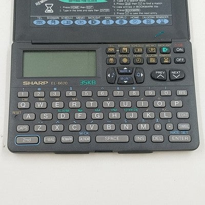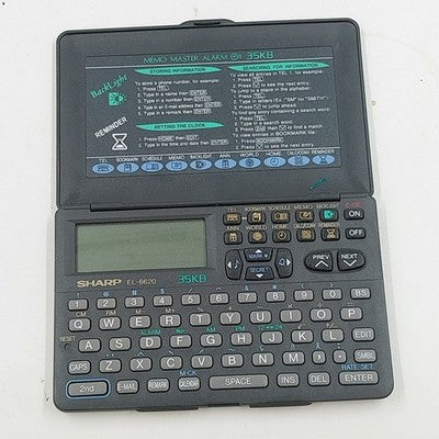 This Sharp EL-6620B Memo Master electronic organizer offers 35KB memory with 9 versatile functions and a backlight display. Compact and portable, it's perfect for collectors of vintage electronics or for practical use.