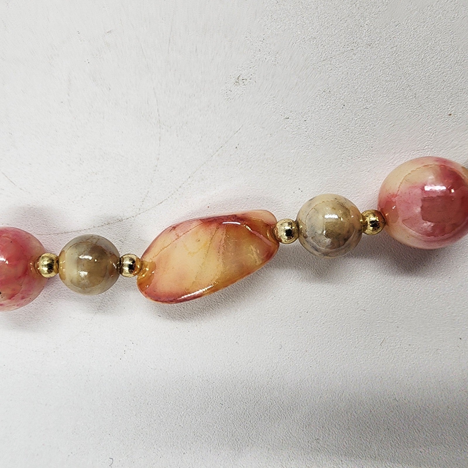 Make a statement with this vintage peach-tone necklace, featuring shiny faux pearl beads in pink, orange, and peach hues. Gold-tone beads elegantly separate each acrylic bead, adding a subtle touch of shimmer.