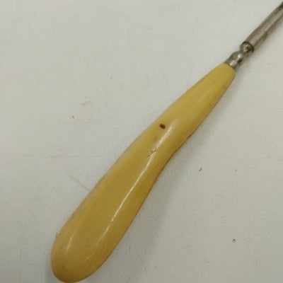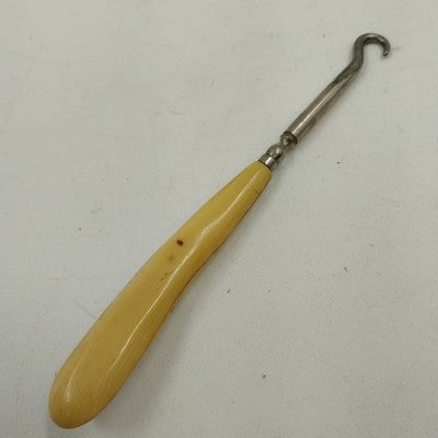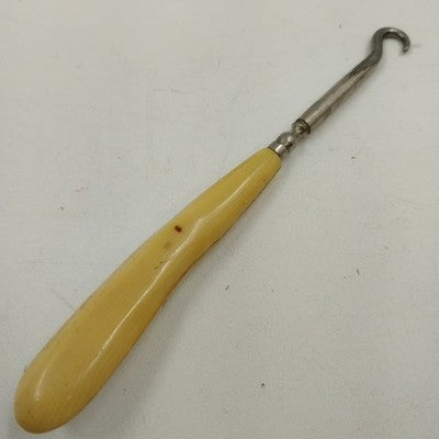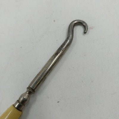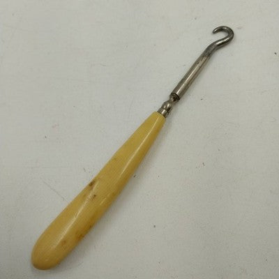 An antique shoe button / corset hook tool from the early 1900s, crafted with a metal hook and a celluloid-style ivory handle resembling bone or Bakelite. A charming piece of fashion history, this tool was once used for fastening corsets and buttoned shoes.