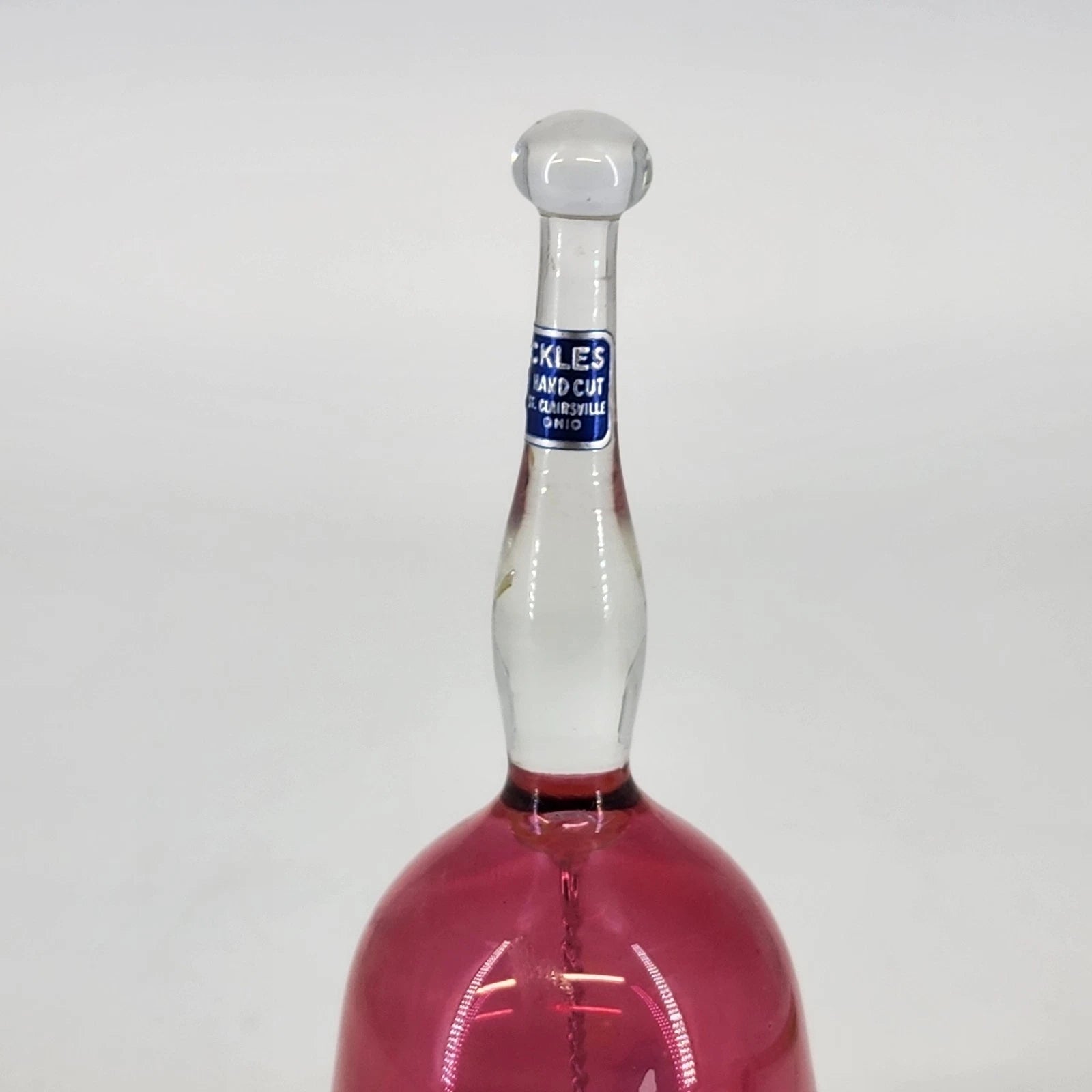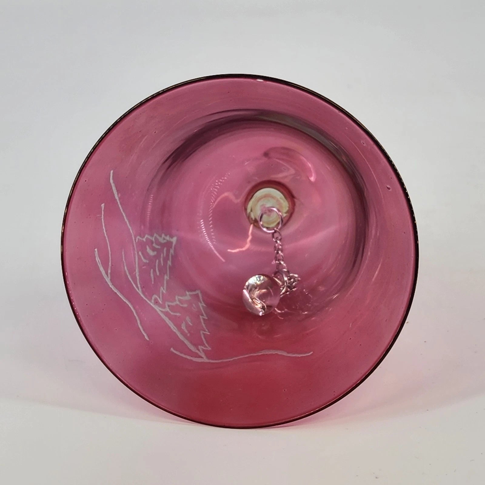 Add a splash of vibrant color and delicate artistry to your collection with this vintage Sickles cranberry glass bell. Hand-blown to a rich, ruby-pink hue, this bell features a beautifully etched winter landscape of pine trees and rolling hills. The contrast between the deep cranberry glass and the frosted etched scene creates a stunning visual, while the clear glass handle and original clapper add a touch of elegant transparency. Whether displayed as a seasonal holiday accent or kept as a year-round treasure for glass enthusiasts, this piece captures the fine craftsmanship of mid-century art glass.
