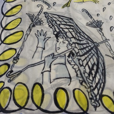 Design: Lady holding a black and yellow umbrella in the rain, black scroll, and royal blue border