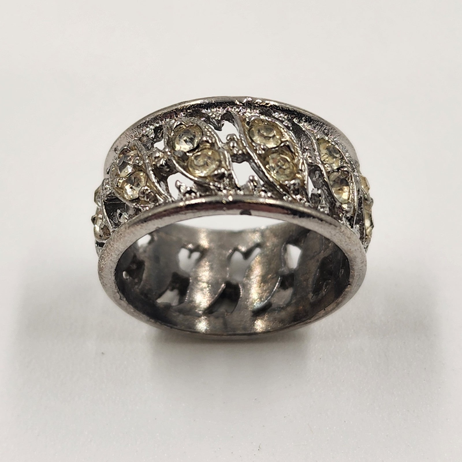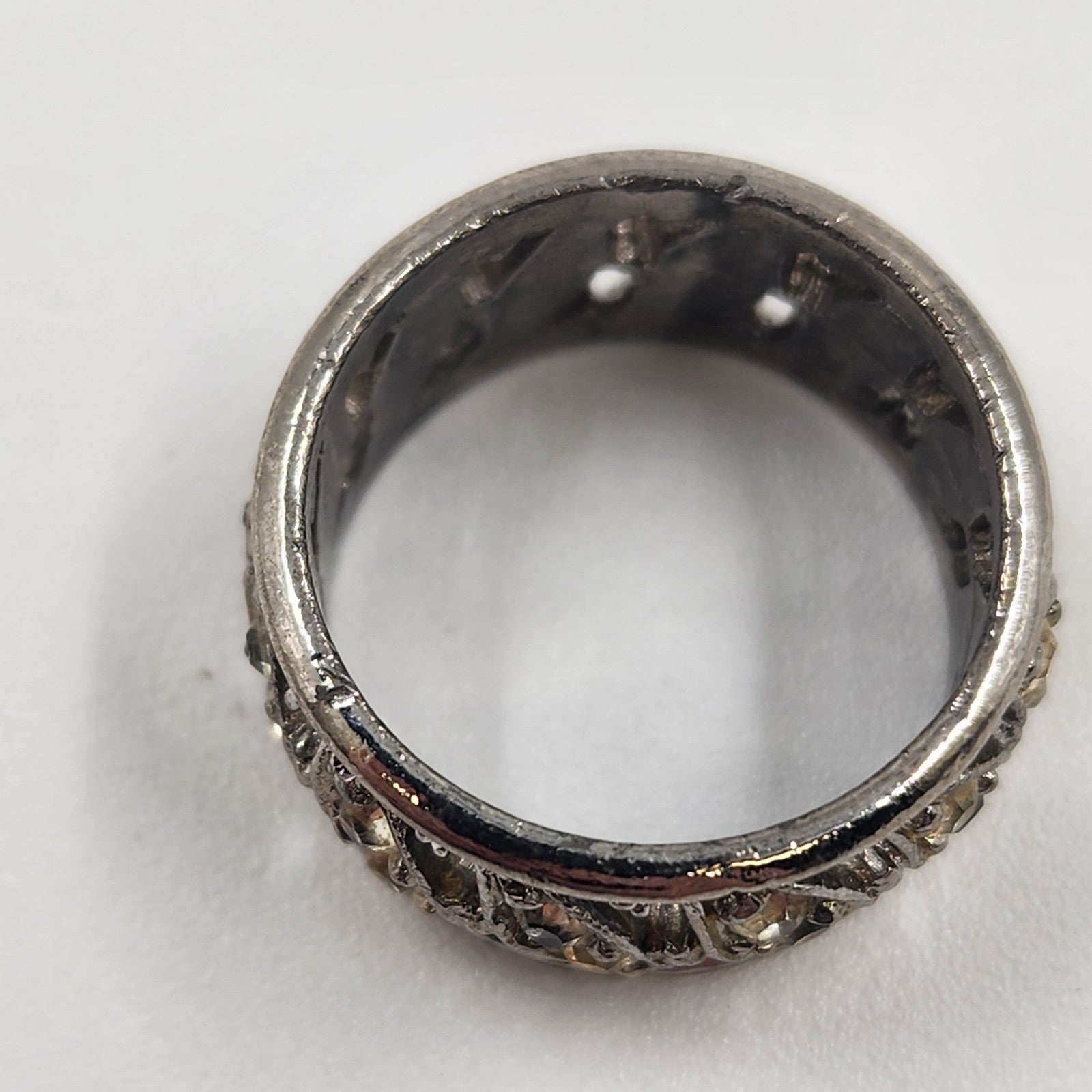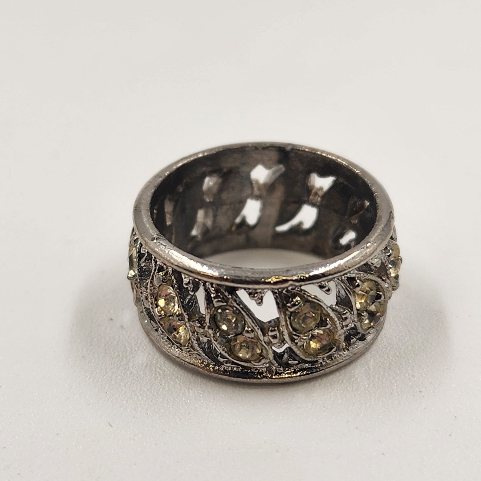 This vintage silver-tone eternity ring is a classic and elegant accessory, featuring a combination of clear crystals and yellow rhinestones. Sized approximately 7-7.5, it's a versatile piece for any jewelry collection. While two small stones are missing, the ring remains a beautiful representation of vintage charm and style, ideal for those who appreciate timeless jewelry with character.