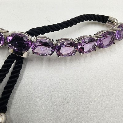 Material: Silver-tone metal, purple faceted crystal rhinestones, and black cord.