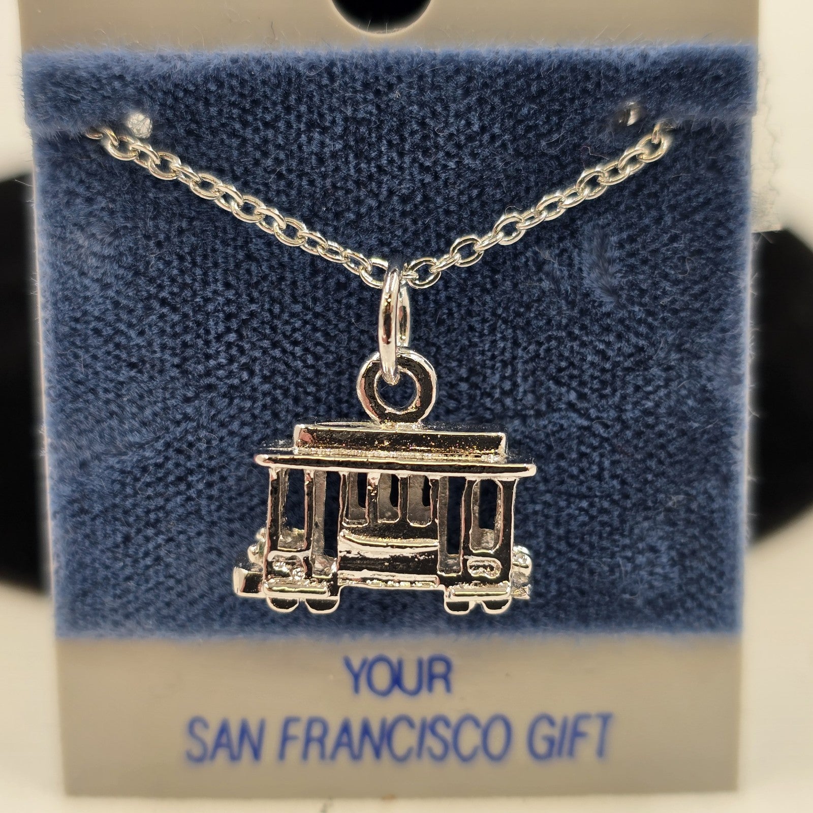 This silver-tone necklace highlights a beautifully detailed 3D San Francisco cable car pendant, capturing the essence of the city's iconic transportation. The pendant hangs on a silver-tone chain that measures approximately 18 inches in length and features a secure spring ring clasp. The total length of the necklace with the pendant is about 9.5 inches.