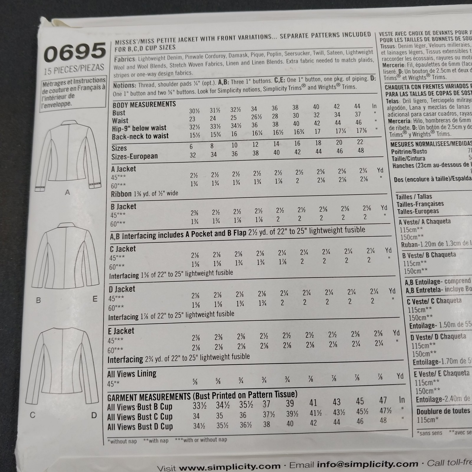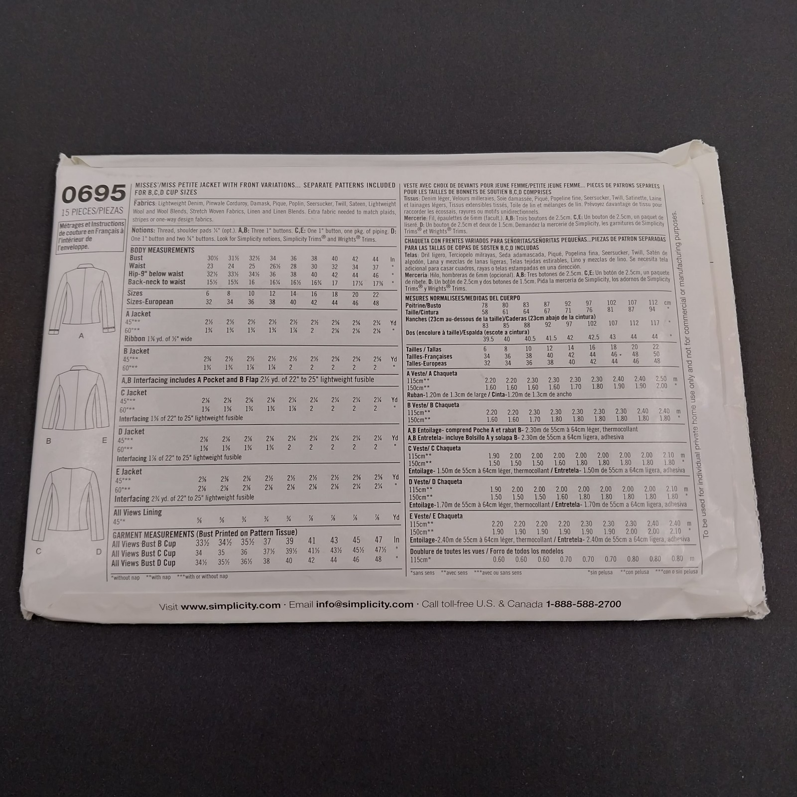 Simplicity 0695 Vintage Sewing Pattern 1980s Misses Petite Jacket Size HH 6 - 12