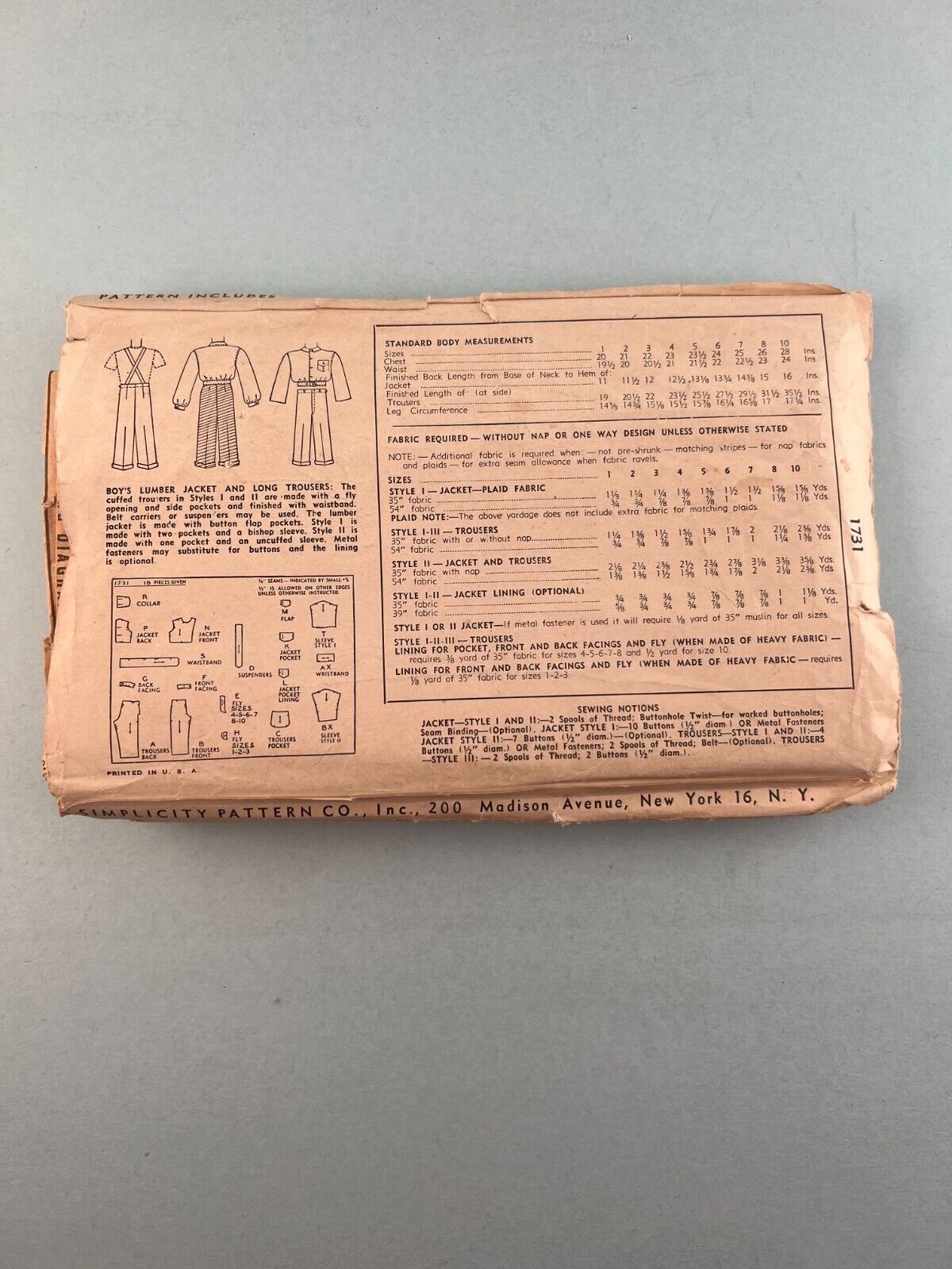 Simplicity 1731 Vintage Sewing Pattern Boys Lumber Jacket and Long Trousers