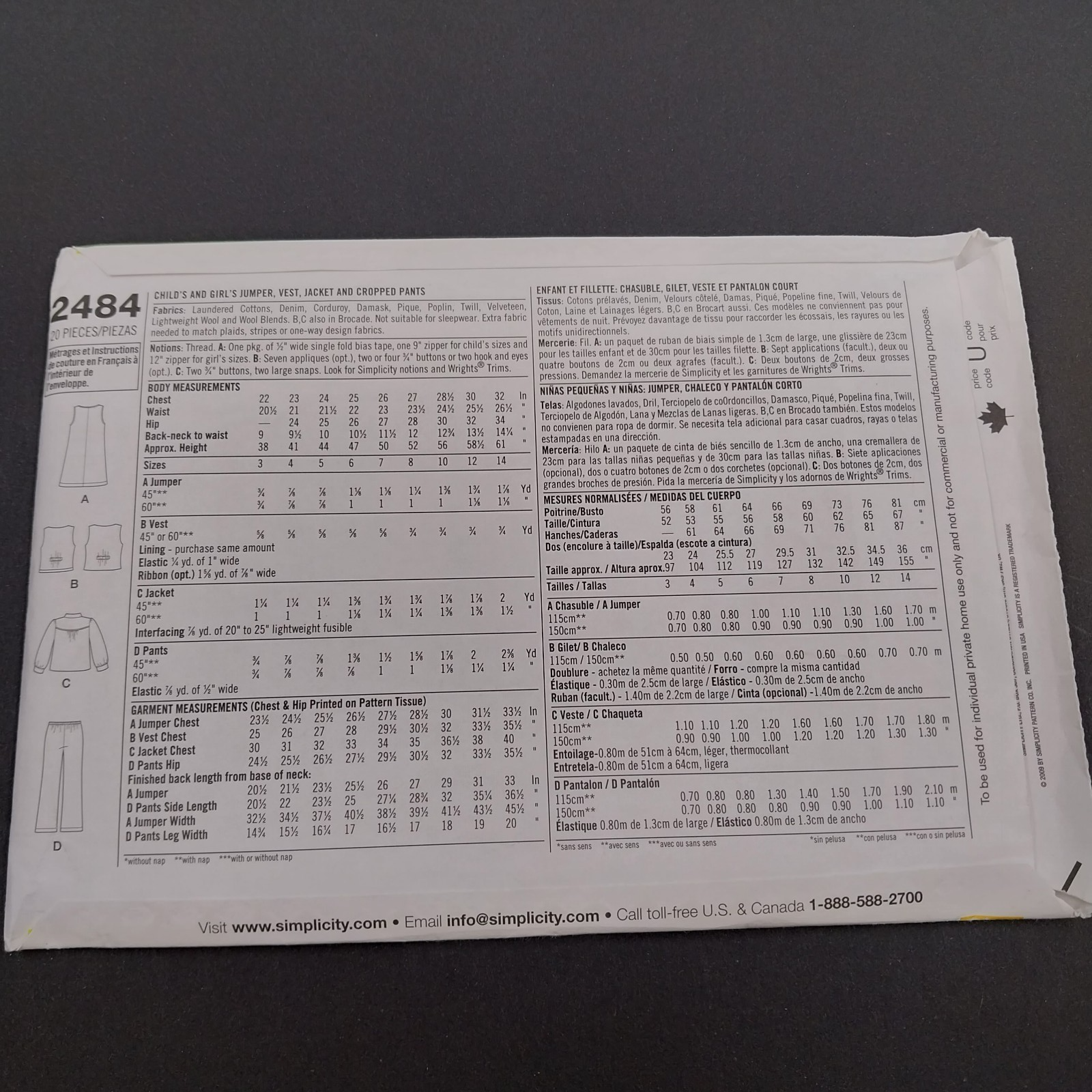 Simplicity 2484 Sewing Pattern UNCUT 2009 Child Jumper Cropped Pant Size HH 3-6