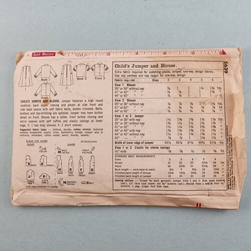 Simplicity 5639 Vintage Child's Jumper and Blouse Sewing Pattern Cut Size 6