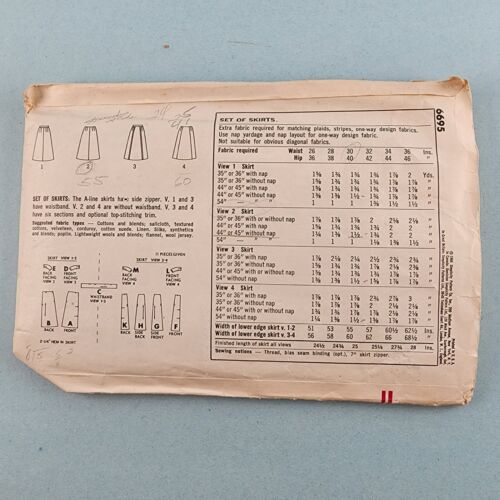 Simplicity 6695 Vintage Sewing Pattern 6695 A-Line Skirts Misses' 1966 Waist 30"