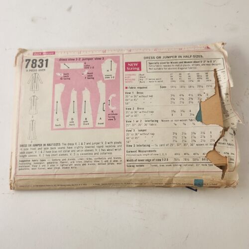 Simplicity 7831 Vintage 1968 Sewing Pattern Dress Jumper Half Size 16 1/2