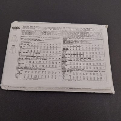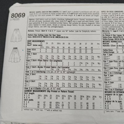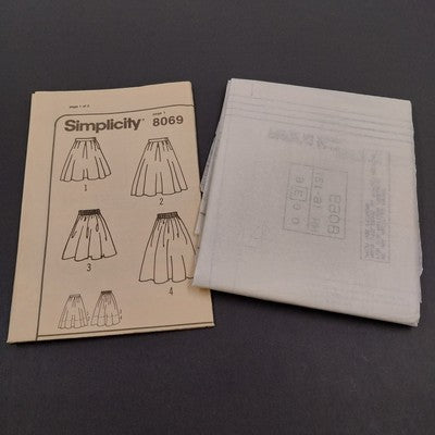 This is a vintage Simplicity 8069 sewing pattern from the 1992, designed for making misses' skirts in sizes 6-12 (HH). The pattern is cut, complete, and includes the original instructions, though the envelope is missing.