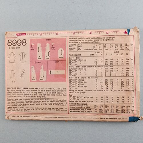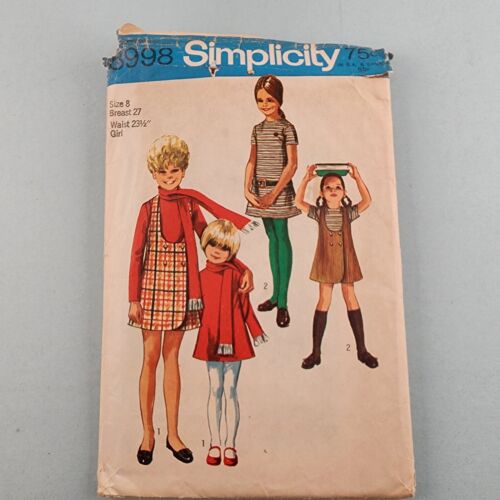 Simplicity 8998 Vintage Girls' Jumper Dress and Scarf Sewing Pattern Cut Size 8