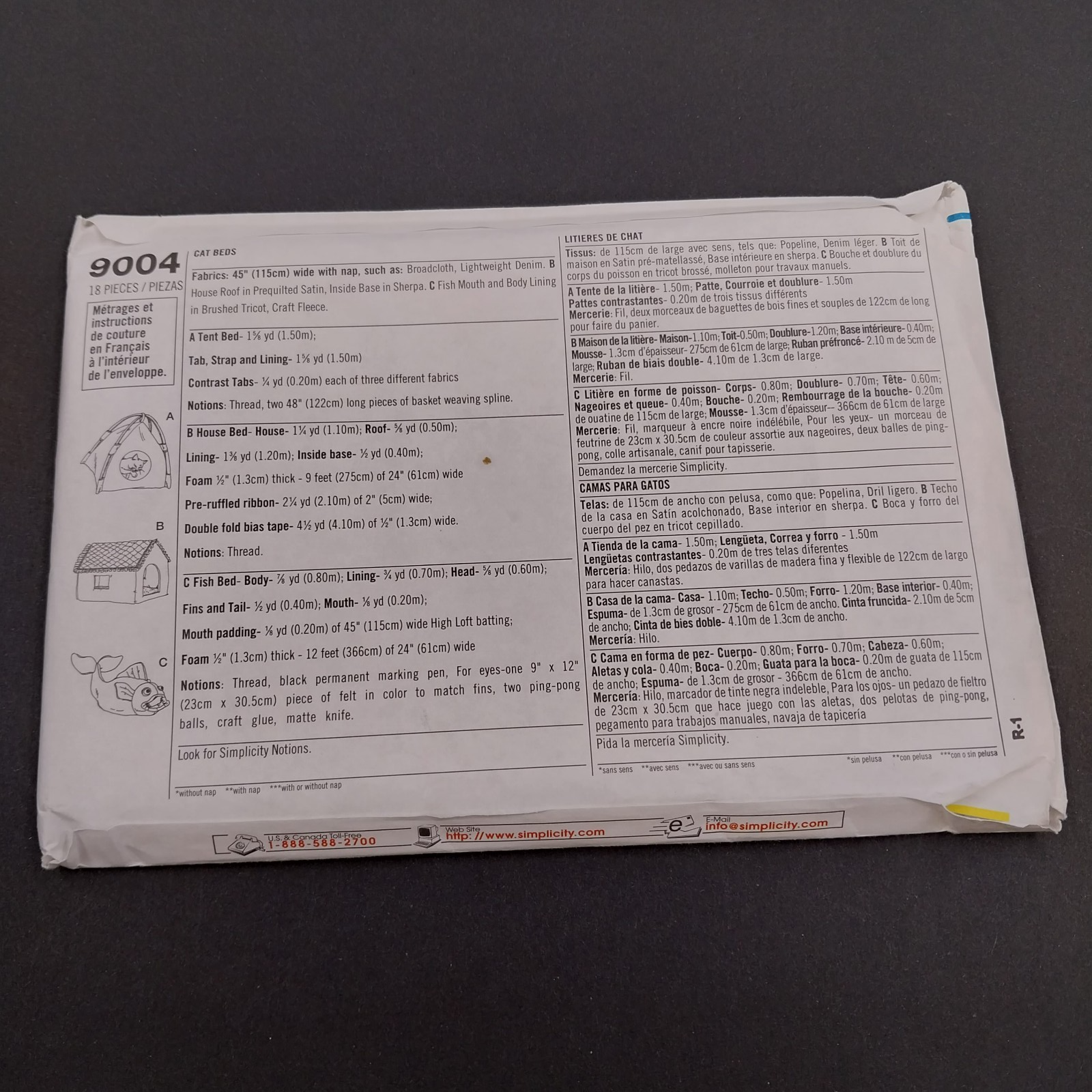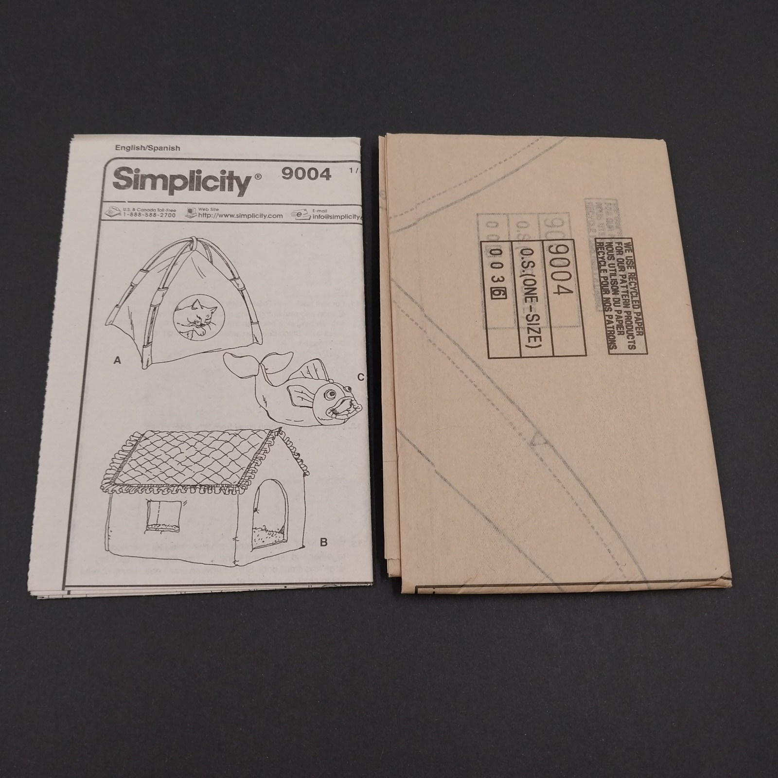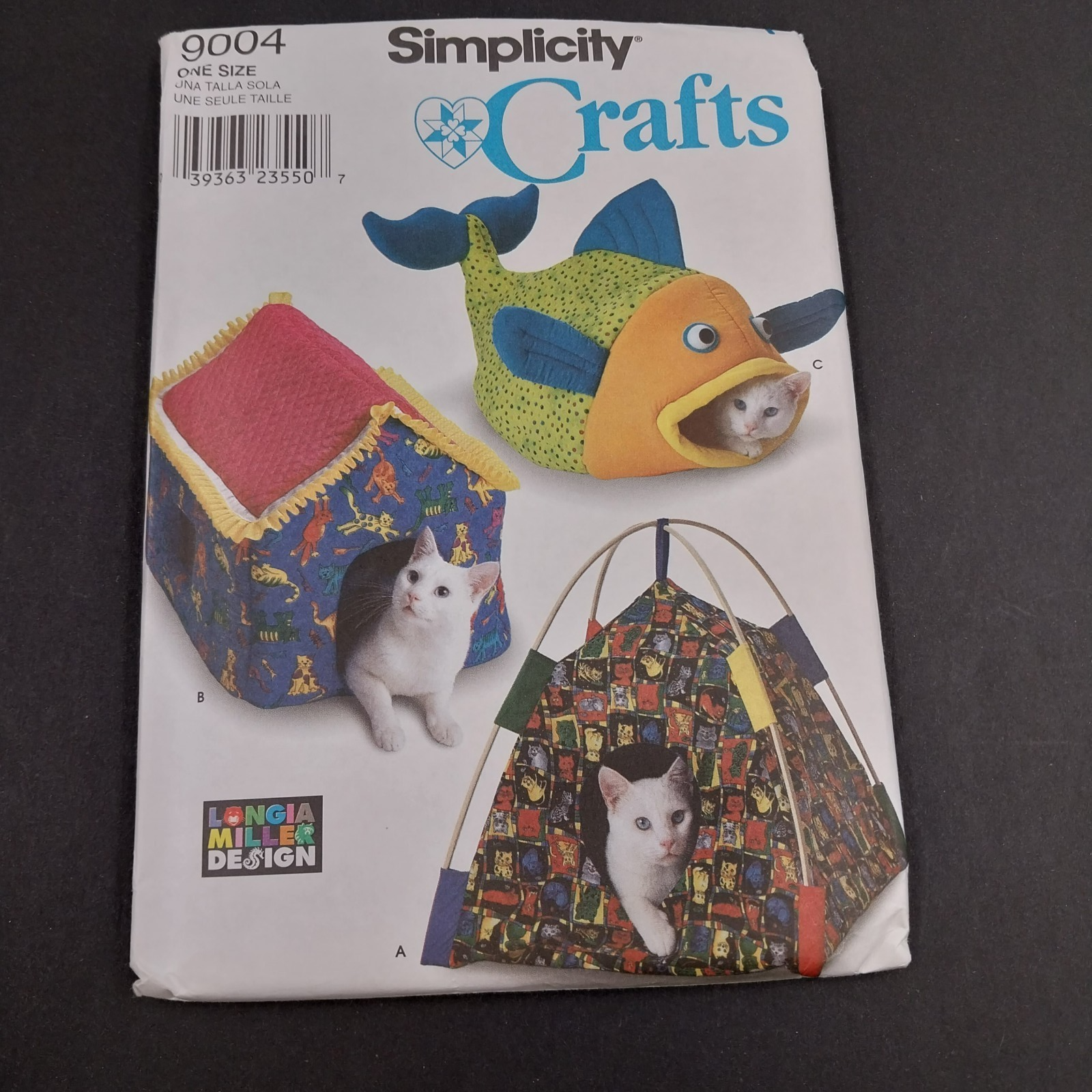 This is a vintage Simplicity 9004 sewing pattern from 1990 for making cat beds in three charming styles: fish, house, and tent. The pattern is in excellent uncut condition and comes complete with instructions.