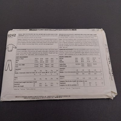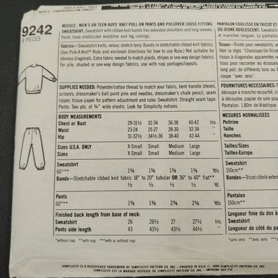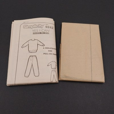 This is a vintage Simplicity 9242 sewing pattern from the 1990s, designed for making unisex pull-on pants and a sweatshirt in Size Medium. The pattern is cut, complete, and comes with the original instructions.