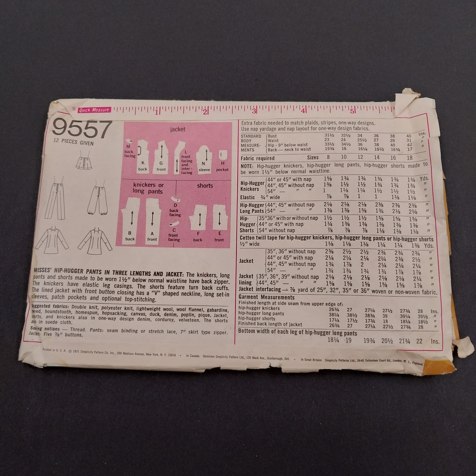 Simplicity 9557 Vtg Sewing Pattern Cut '71 Misses Hip Hug Pants & Jacket Size 12