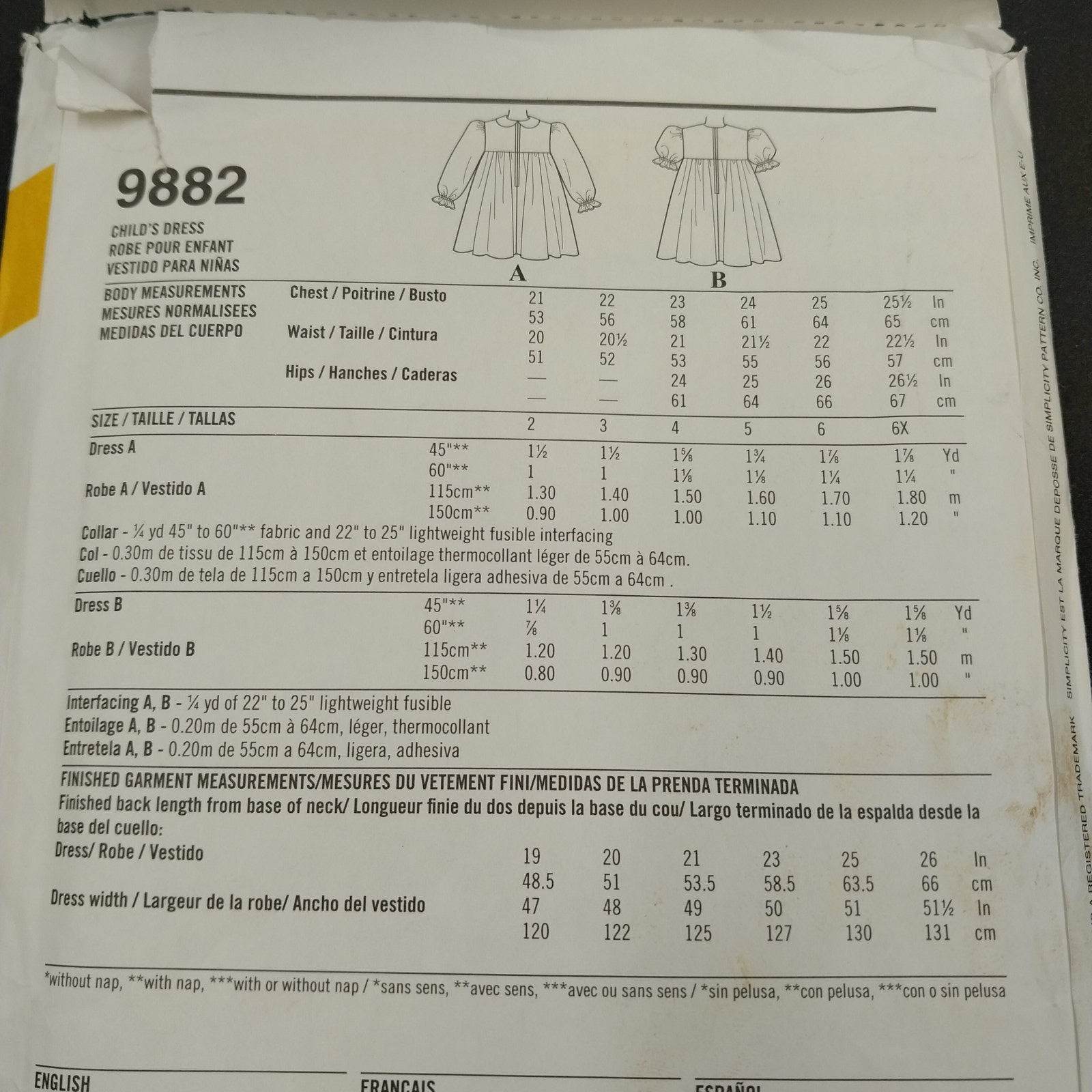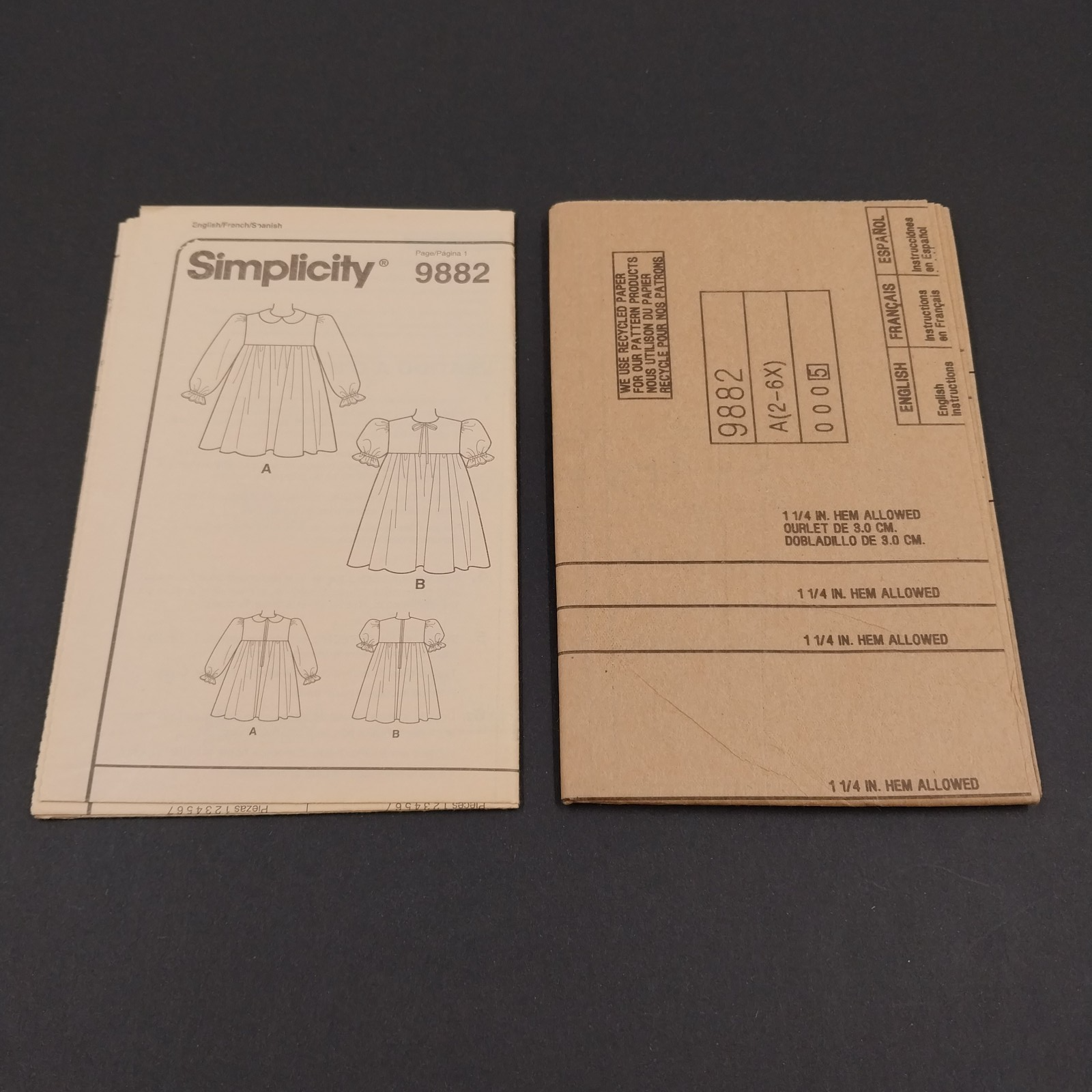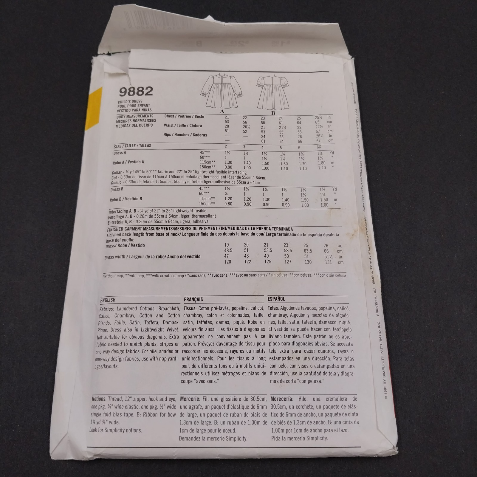 This listing features a vintage Simplicity 9882 sewing pattern for adorable child's dresses, perfect for little ones in sizes A (2-6X). The pattern dates from the 1990s and is in very good, uncut condition, complete with original instructions.