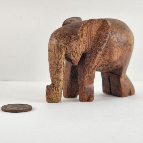 This small wooden elephant figurine is a beautiful addition to any collection. Hand-carved with intricate details, this 2.25-inch elephant stands out with its smooth texture and unique design. Crafted from wood, this figurine is a perfect representation of the majestic animal it portrays. The origin of this piece is unknown, adding an air of mystery to its already intriguing presence. Ideal for collectors of elephant figurines, or those who appreciate the artistry of hand-carved wooden pieces, this item is sure to impress. Its small size makes it perfect for displaying on a shelf or desk, adding a touch of exotic charm to any room.