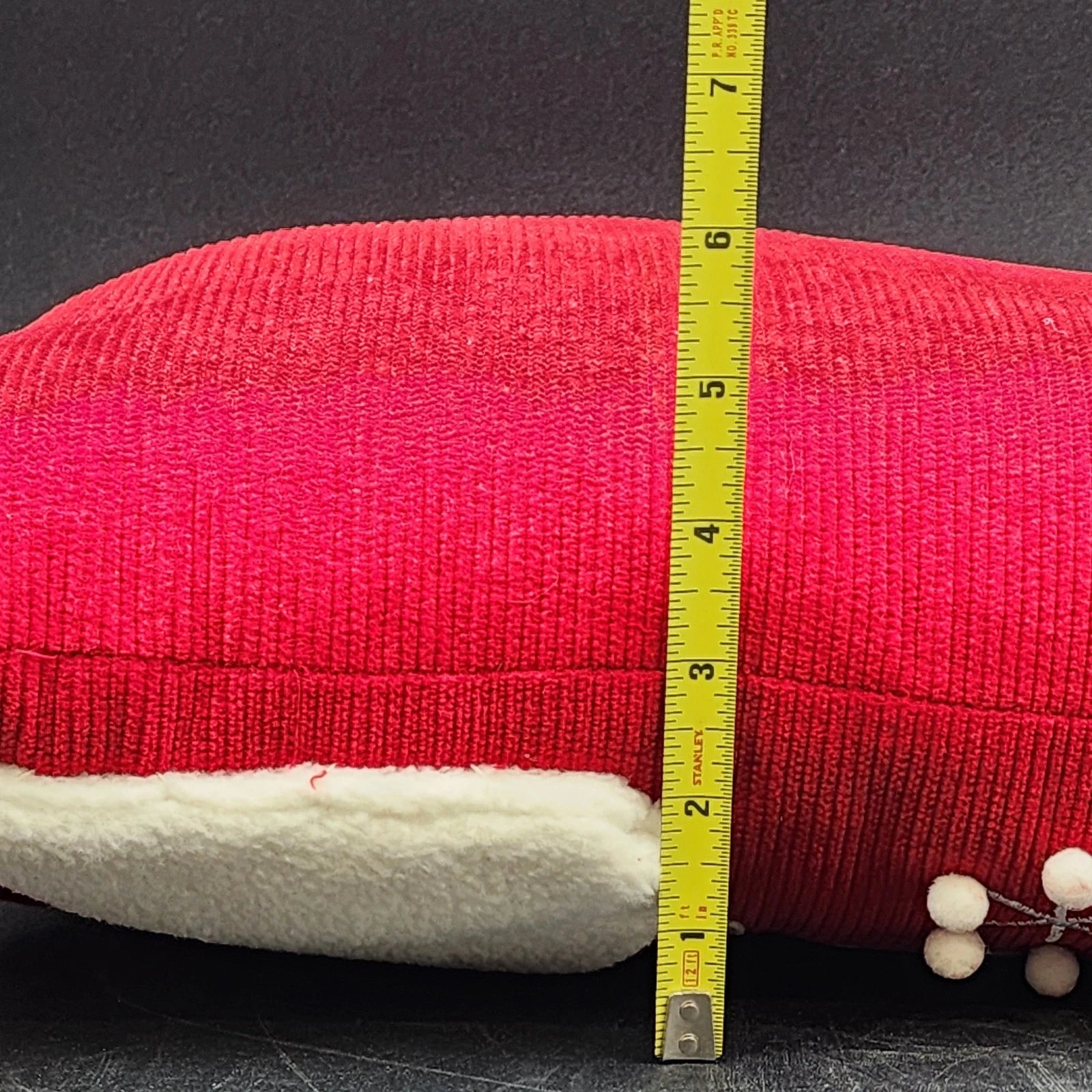 Add a festive and whimsical touch to your holiday seating with this "Let It Snow" decorative throw pillow. The rectangular pillow features a plush, 3D snowman figure attached to a red tapestry/corduroy body, beautifully accented with white piping and pom-poms. The phrase "Let it Snow" is embroidered in white, making this an ideal accent for winter seasonal decor.