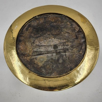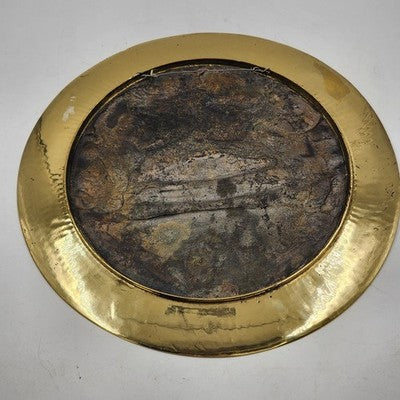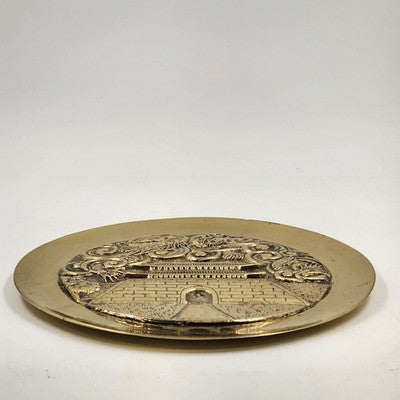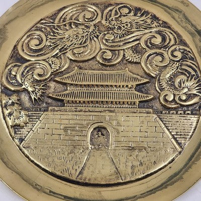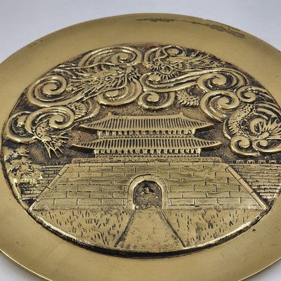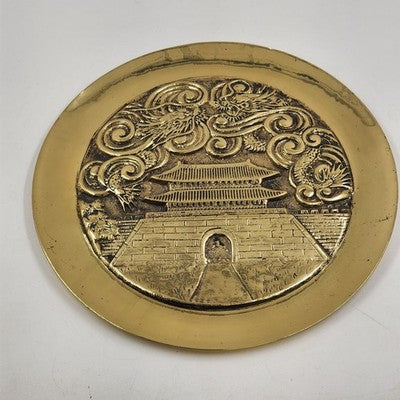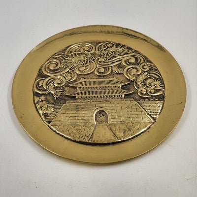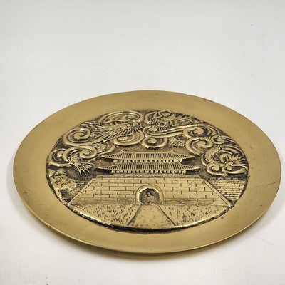 Beautiful and heavy solid brass charger plate featuring an engraved temple design with Yin Yang symbol and Asian dragons. A striking decorative piece with rich detail and patina. Perfect for collectors of Asian art, brass décor, or statement wall pieces.