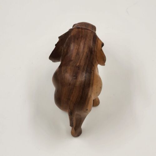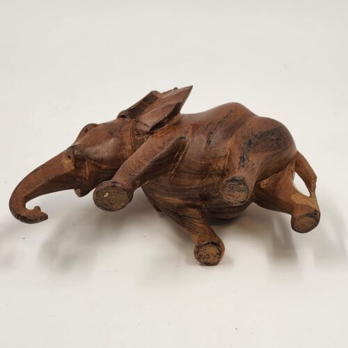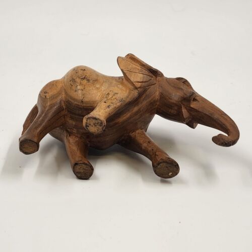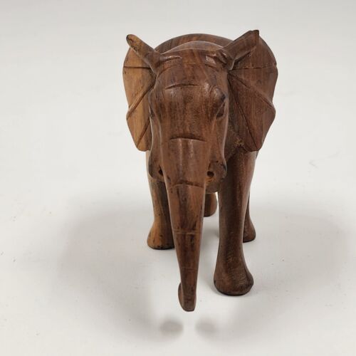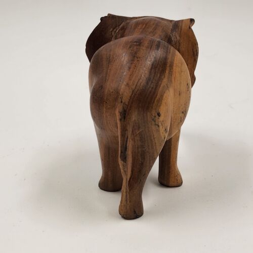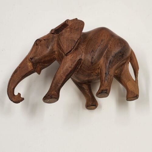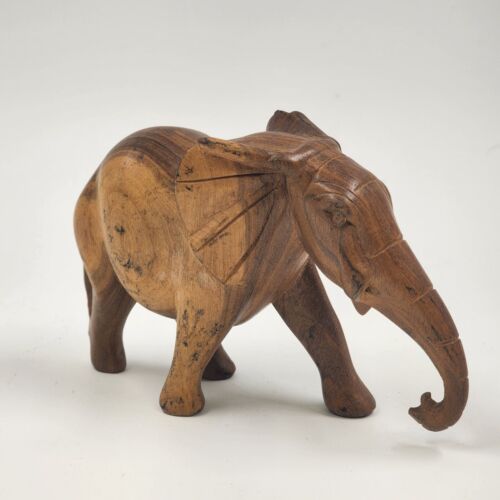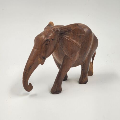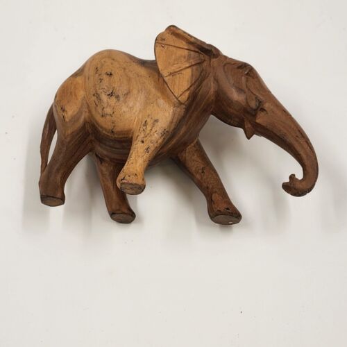 This is a 3.5" solid hardwood elephant figurine in a walking position. It has a natural smooth finish and is missing tusks. The elephant is made of wood and is not handmade. It is a vintage piece.