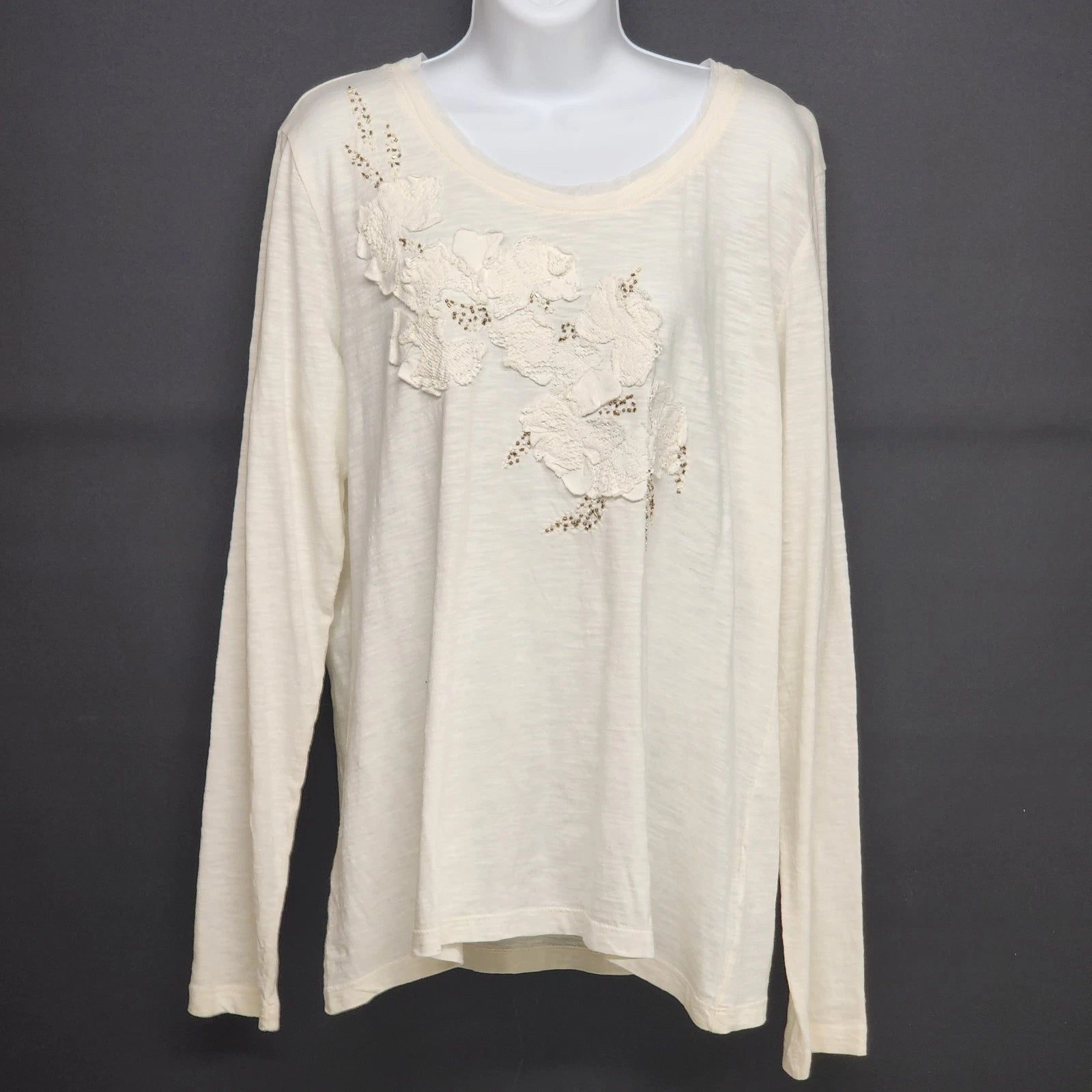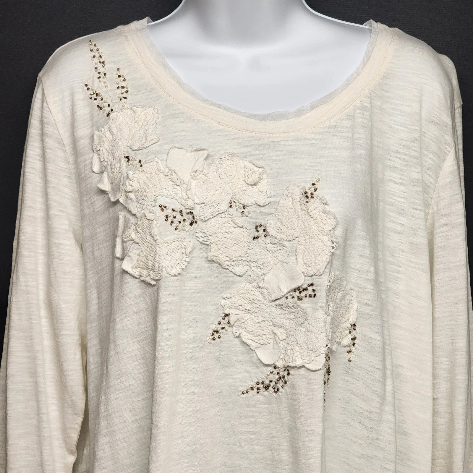 Sonoma Goods For Life XL Cream Long Sleeve Tee Lace Flower Pearl Bead Detail 24"