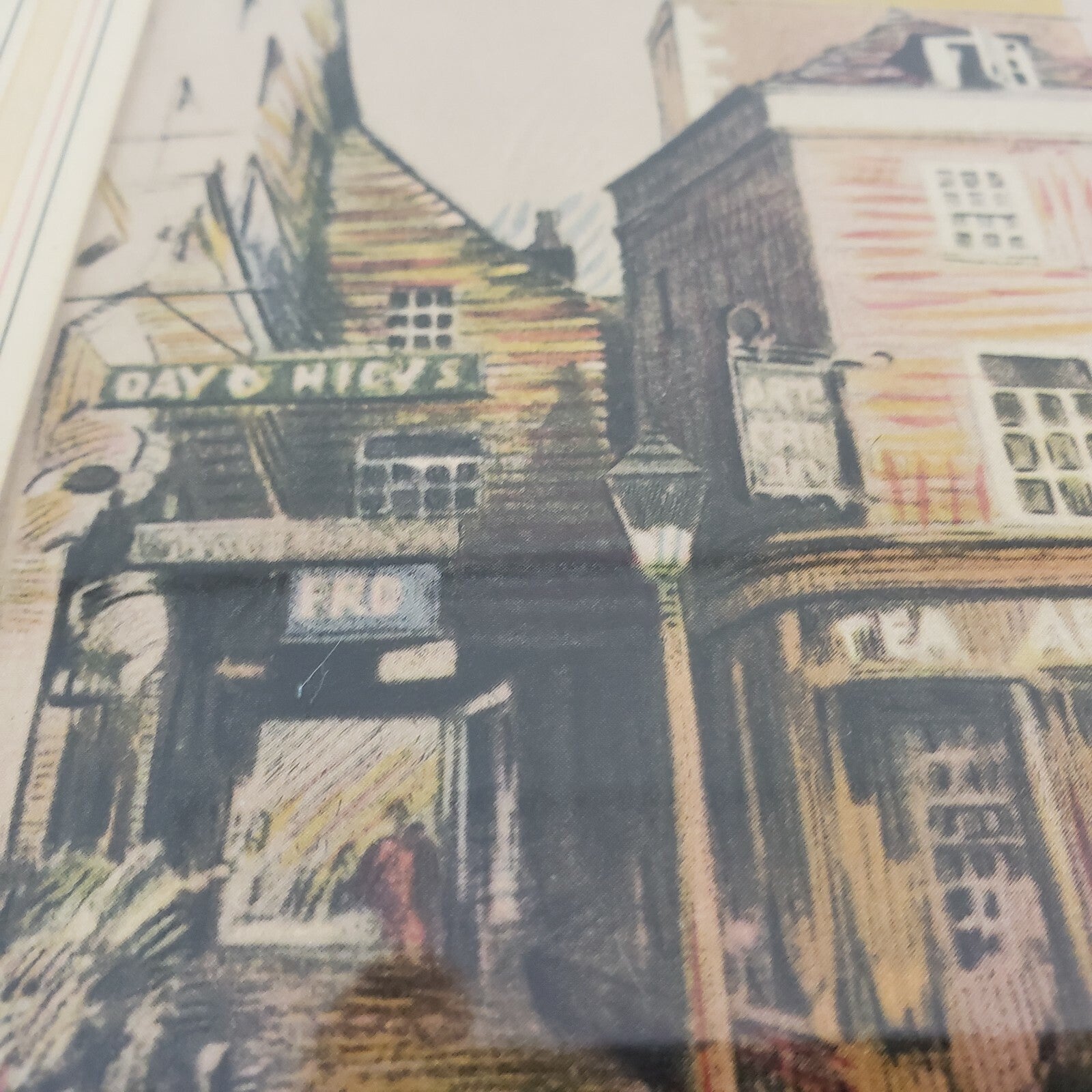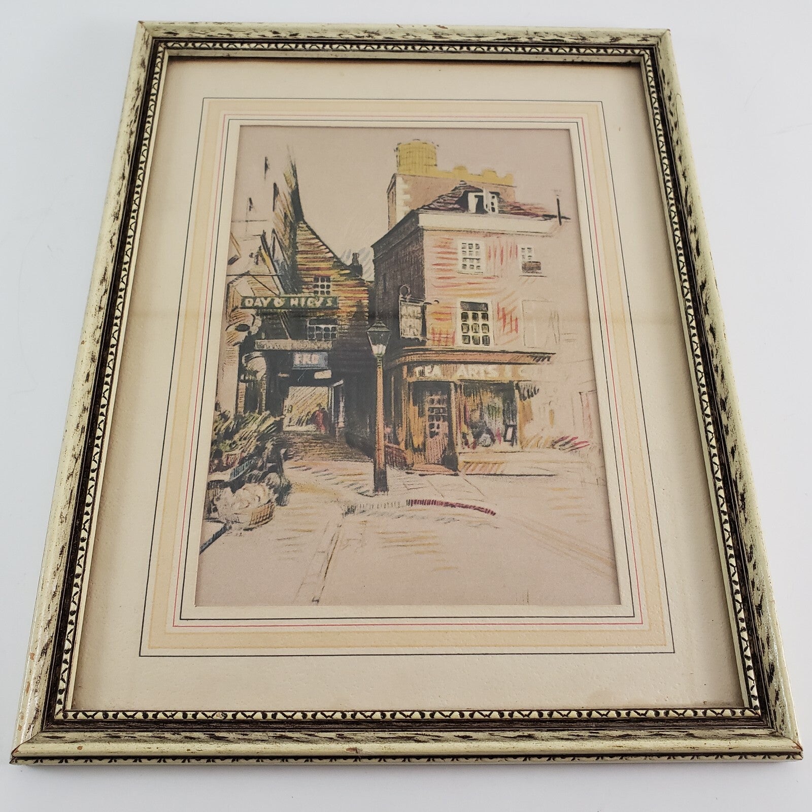 Charming vintage framed artwork featuring a village street scene rendered in colored pencil style. Nicely matted and framed with a blonde-and-black rubbed wood frame, this piece is ready to hang and display.