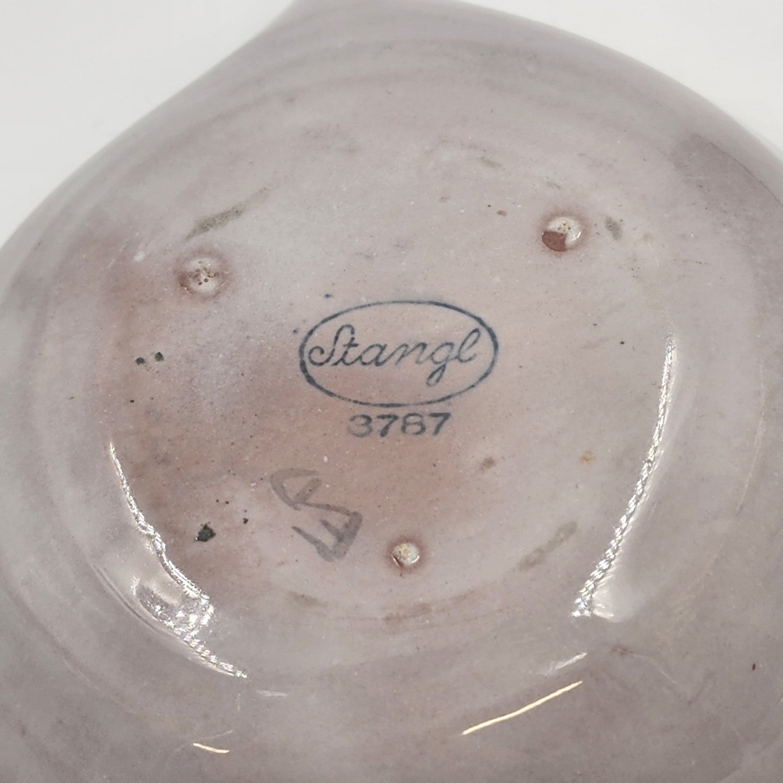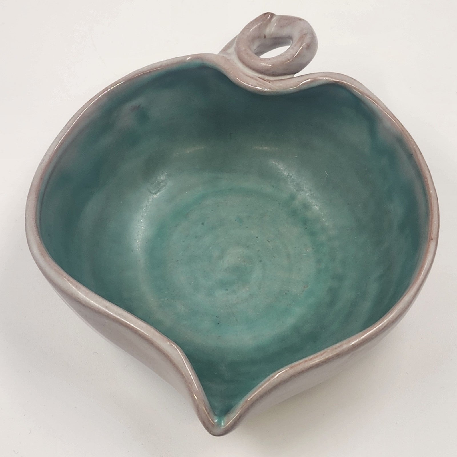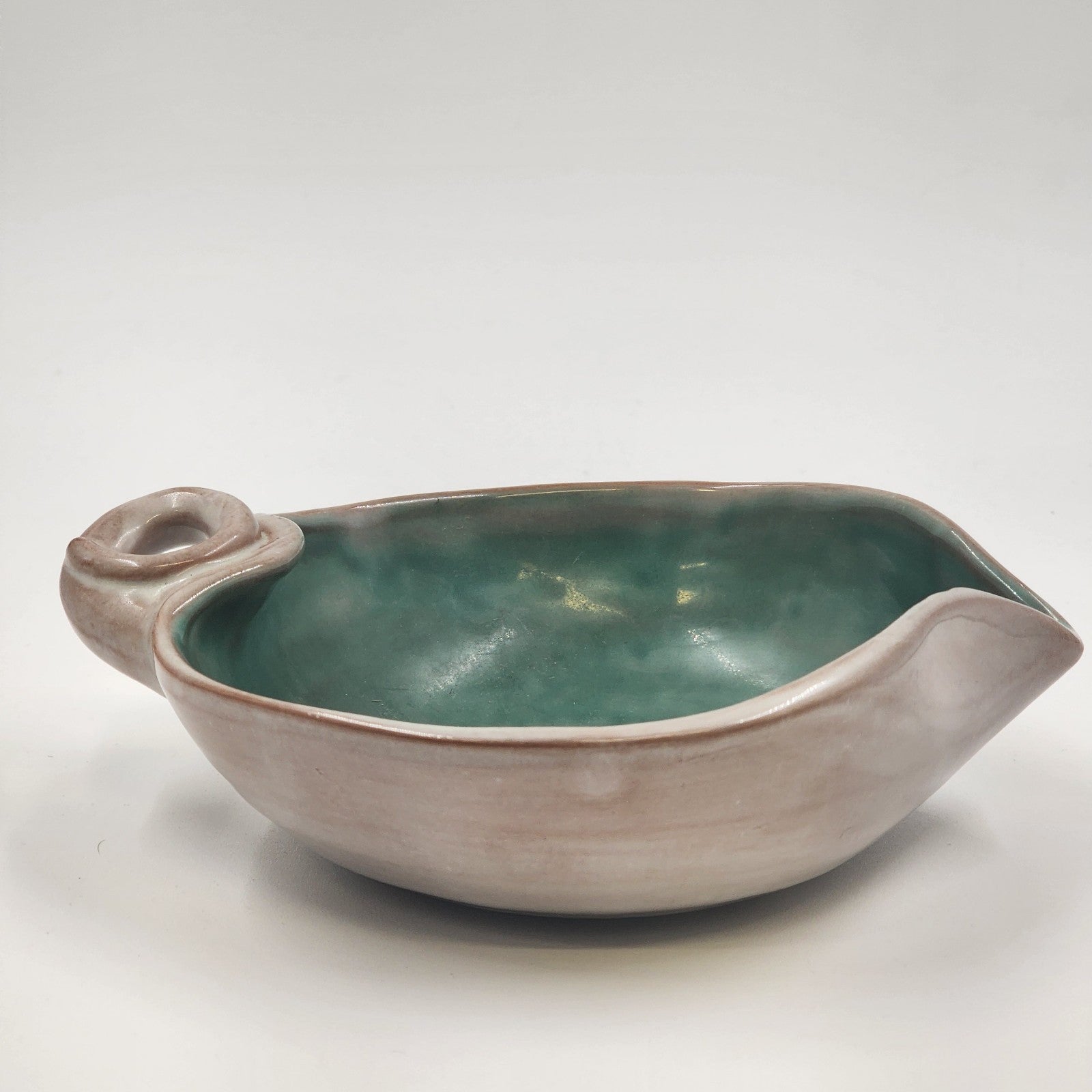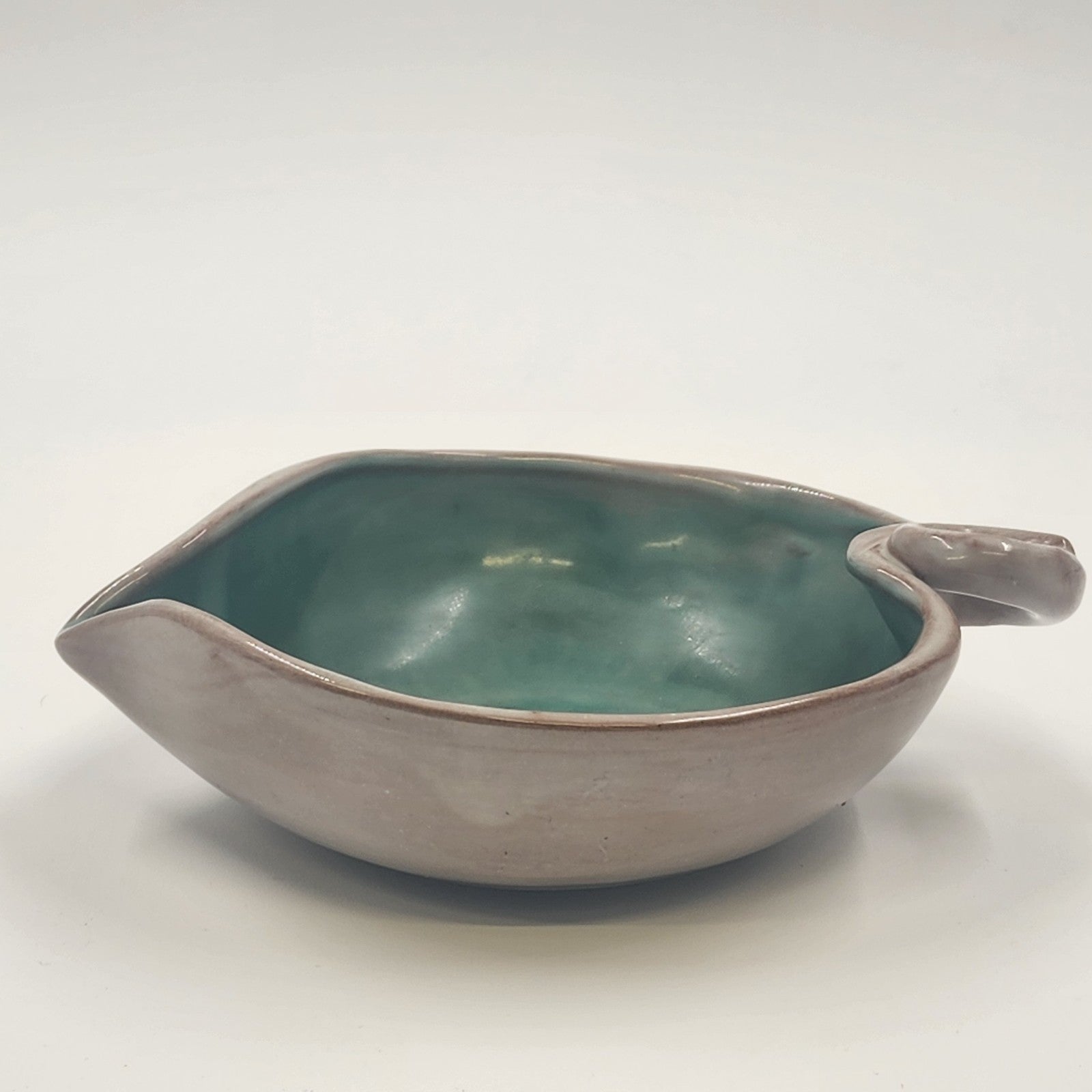 This is a vintage Stangl Pottery candy dish in the shape of a leaf, with a turquoise interior and gray exterior. It is from the Mid-Century Modern era, made in the United States in the 1960s or 1970s. The dish is a limited edition, featuring a semi-gloss finish and printed backstamp. It measures 7 inches in length, 6 inches in width, and 1.75 inches in height, weighing 11 ounces. Perfect for all occasions and hand wash only.