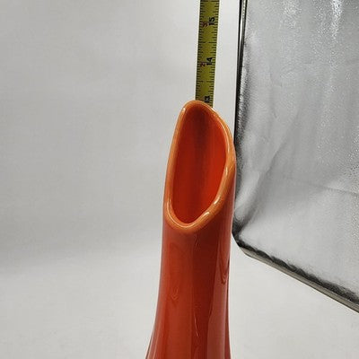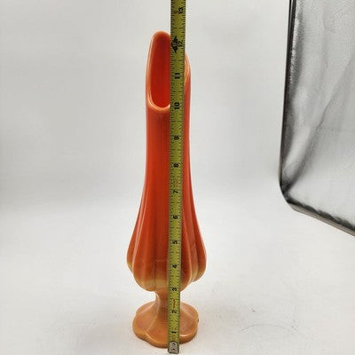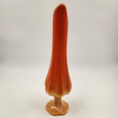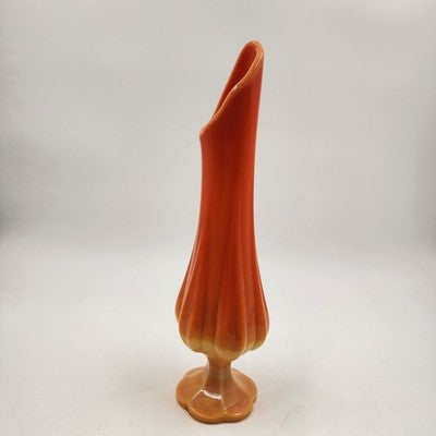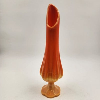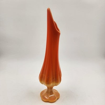 A striking Mid-Century Modern swung glass vase in a vibrant orange bittersweet color. Features a tall pedestal footed base and elongated swung form, perfect for retro décor or collectors of L.E. Smith glass.
