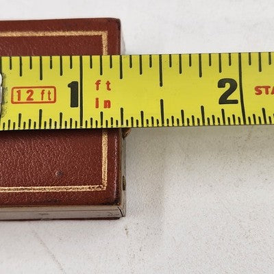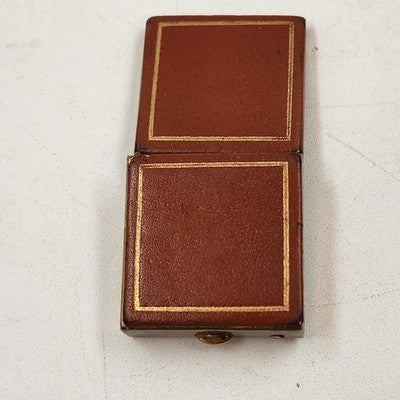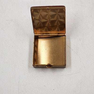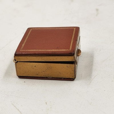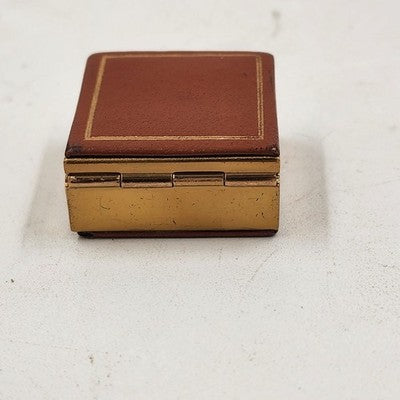 Vintage pill box / trinket jewelry case with a tan faux leather top and bottom accented by a gold metal finish. Compact and elegant, perfect for holding small pills, keepsakes, or jewelry.